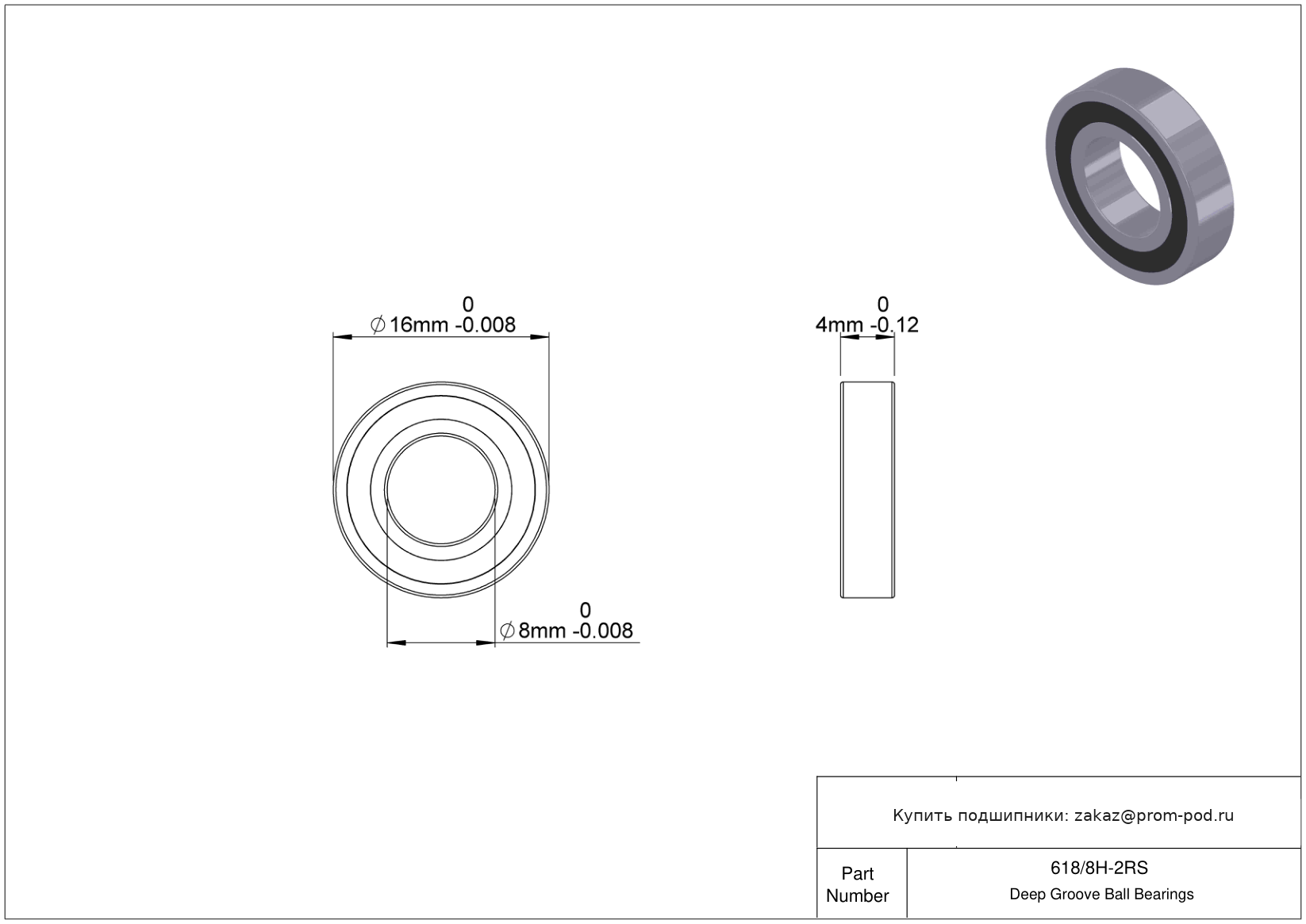 | 618/8-2RS | Шариковый подшипник | Уплотнение с обеих сторон, NBR. |