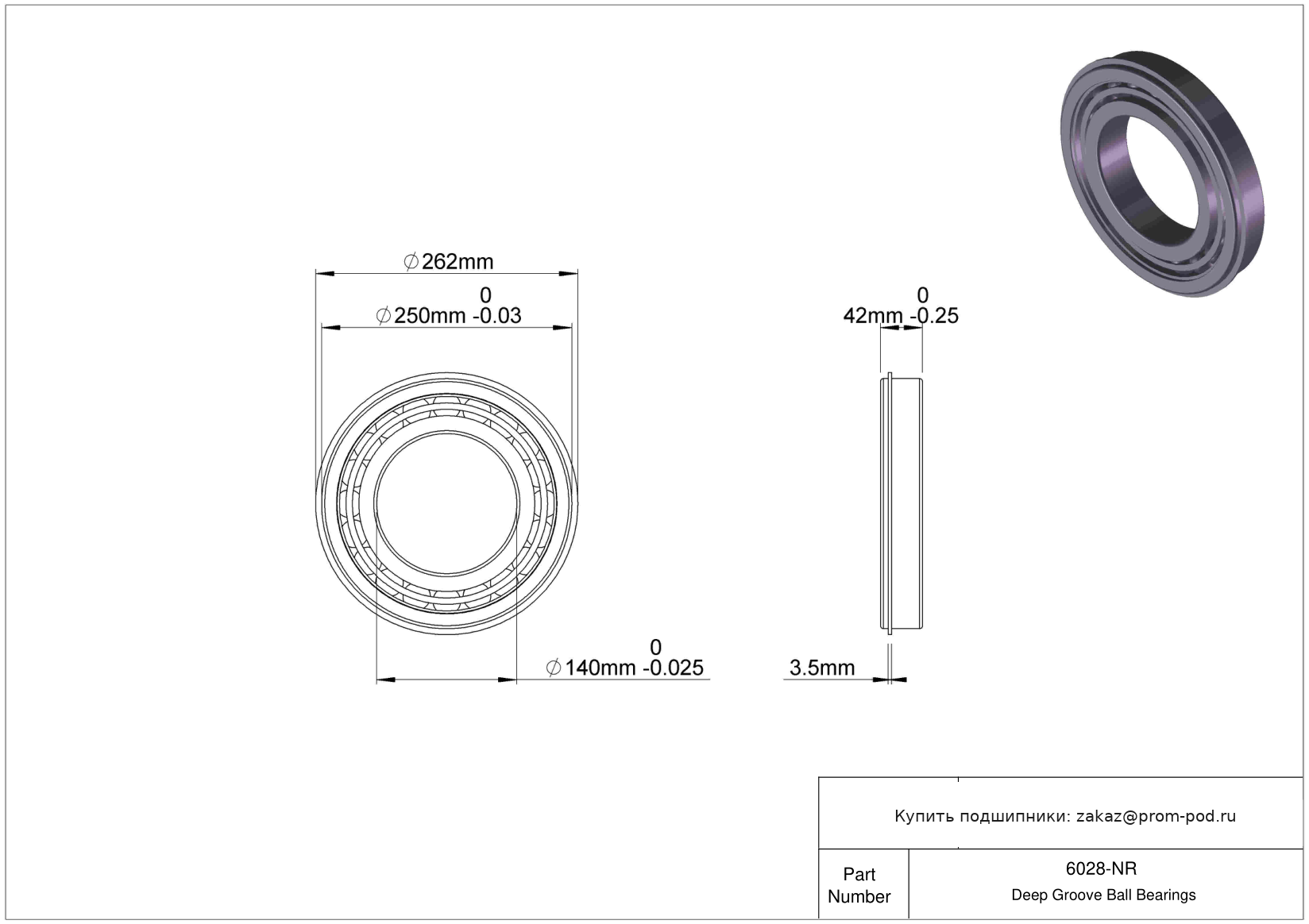 | 6028-NR-C3 | Шариковый подшипник | Внутренний зазор больше нормального. Канавка для стопорного кольца в наружном кольце подшипника и соответствующее стопорное кольцо. |