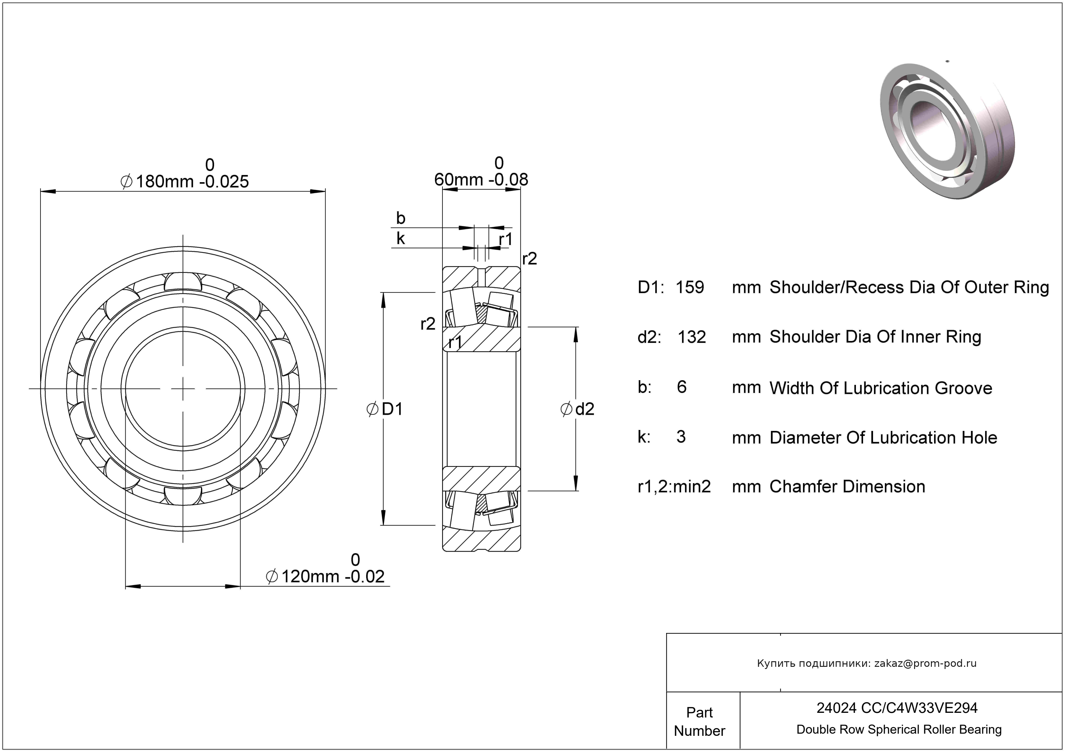 Для двухрядных цилиндрических роликоподшипников: канавка для смазки и отверстия для смазки в наружном кольце (зависит от размера подшипника: E, E1, E2, E3, E4). Для сферических роликоподшипников: канавка для смазки и отверстия для смазки в наружном кольце. Угол контакта 25 градусов. Внутренний зазор больше нормального. Внутренний конструкторский индекс. Войлочное контактное уплотнение.