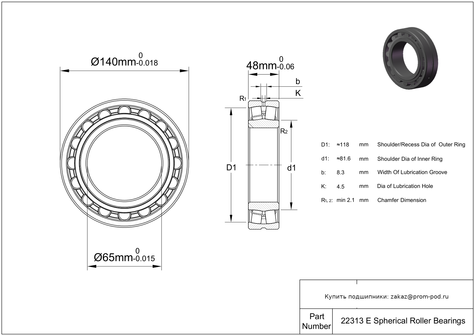 Для двухрядных цилиндрических роликоподшипников: канавка для смазки и отверстия для смазки в наружном кольце (зависит от размера подшипника: E, E1, E2, E3, E4). Для сферических роликоподшипников: канавка для смазки и отверстия для смазки в наружном кольце. Готический арочный угловой контакт со стопорным кольцом и бронзовым фиксатором.