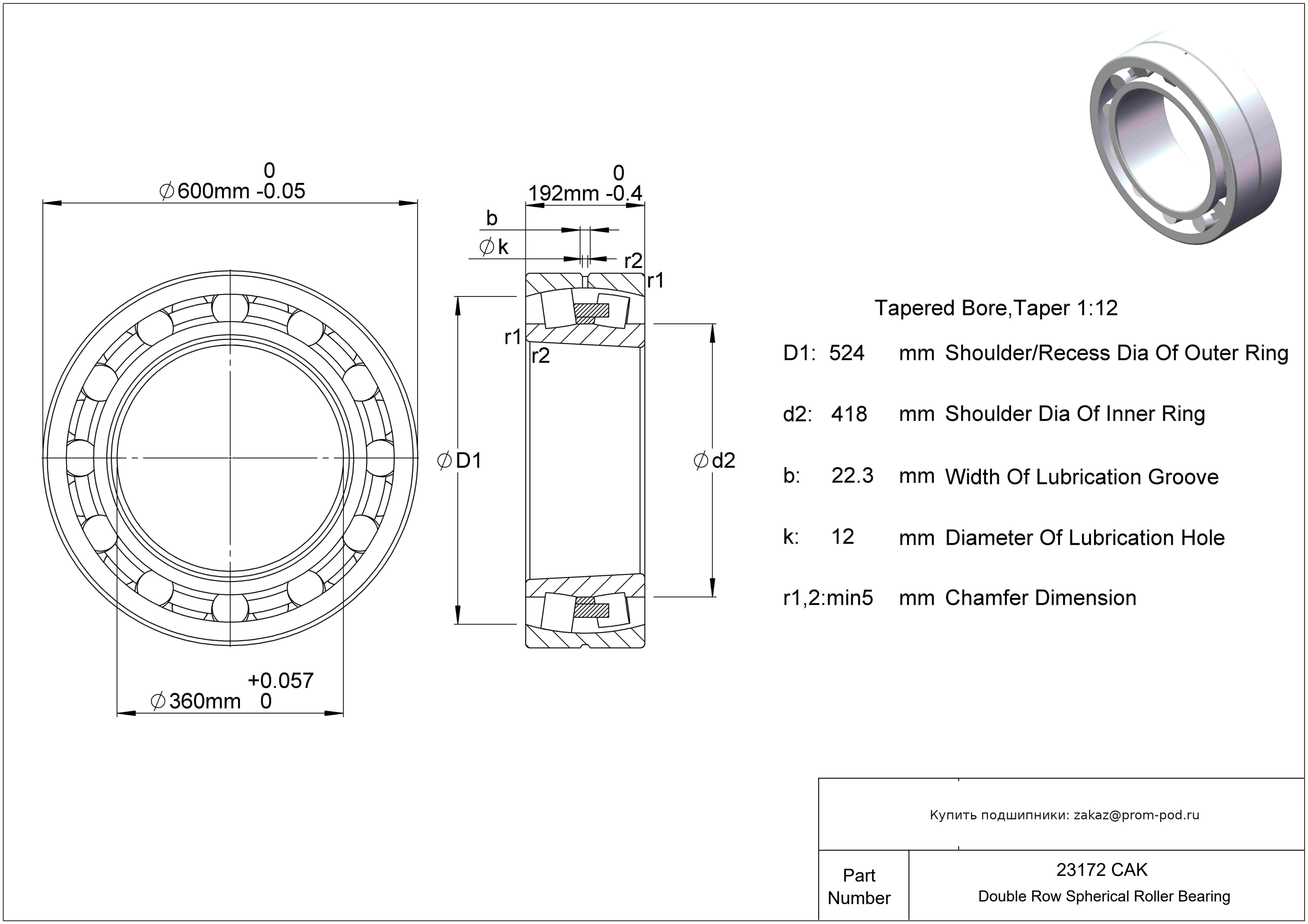 Для двухрядных цилиндрических роликоподшипников: канавка для смазки и отверстия для смазки в наружном кольце (зависит от размера подшипника: E, E1, E2, E3, E4). Для сферических роликоподшипников: канавка для смазки и отверстия для смазки в наружном кольце. Радиальный сферический роликоподшипник исполнения СА с улучшенным ведением роликов и, благодаря этому, сниженным потерям на трение. Внутренний зазор больше С3. Коническое отверстие (1:12 по диаметру).