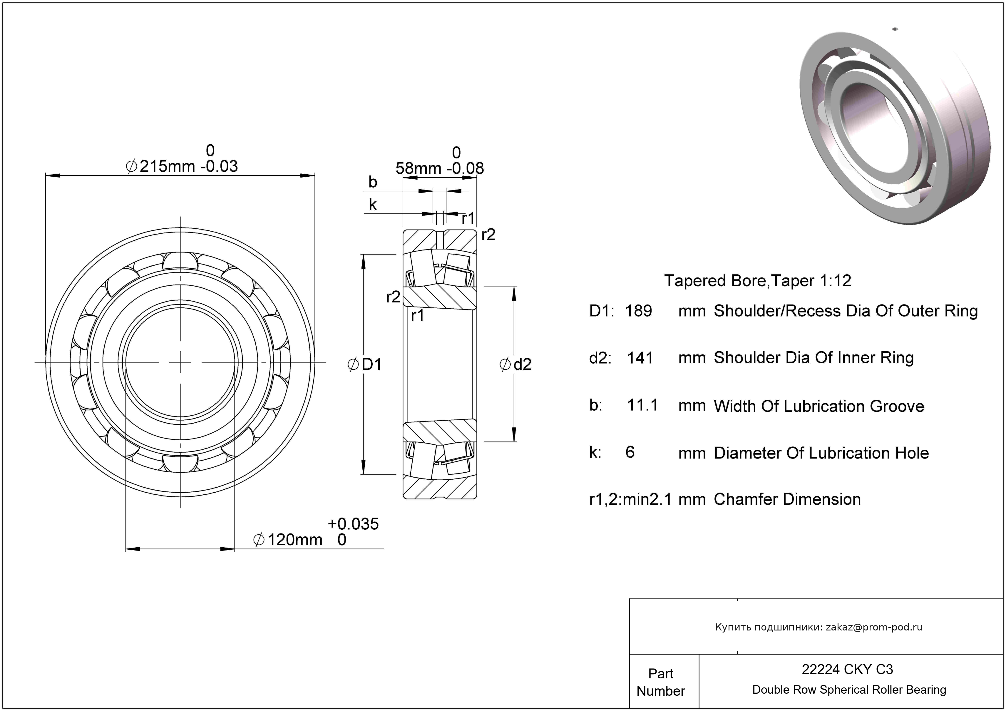 Для двухрядных цилиндрических роликоподшипников: канавка для смазки и отверстия для смазки в наружном кольце (зависит от размера подшипника: E, E1, E2, E3, E4). Для сферических роликоподшипников: канавка для смазки и отверстия для смазки в наружном кольце. Внутренний зазор больше нормального. Коническое отверстие (1:12 по диаметру).