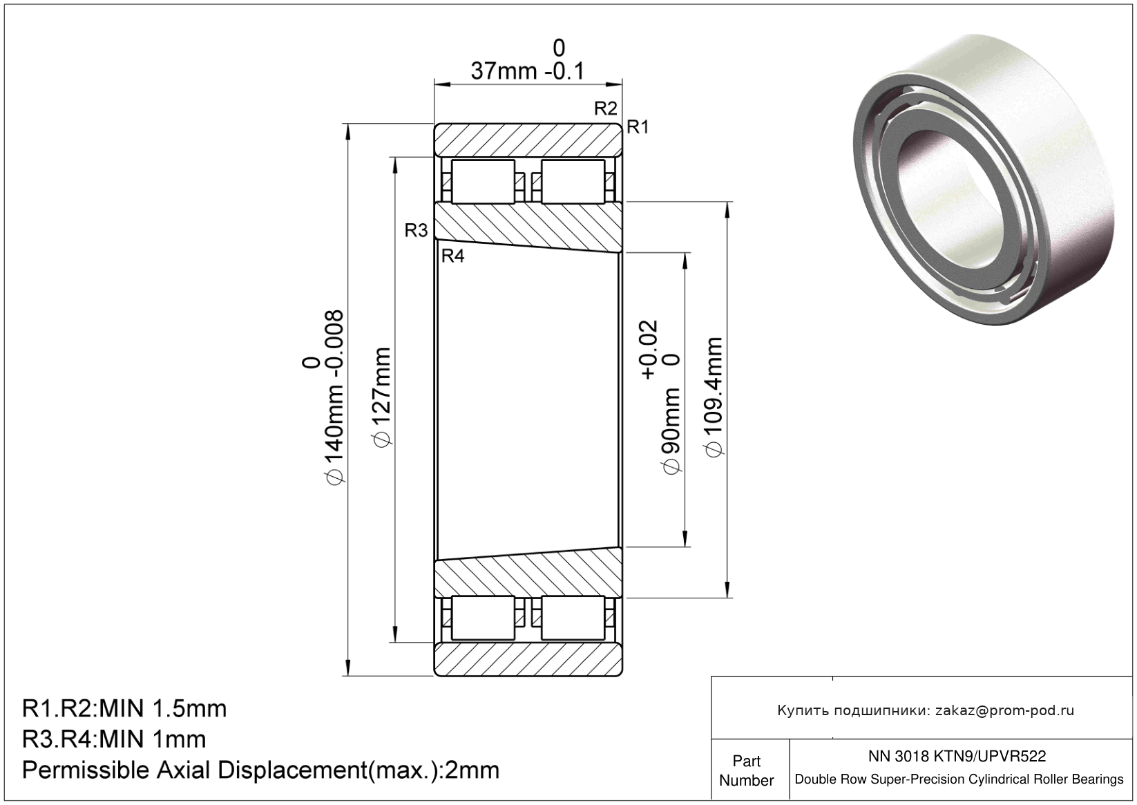 Двухрядный цилиндрический роликоподшипник. Литой сепаратор из монолитного спроектированного полимера. Внутренний конструкторский индекс. Коническое отверстие (1:12 по диаметру). Оптимизированная геометрия контакта и качество обработки поверхностей.