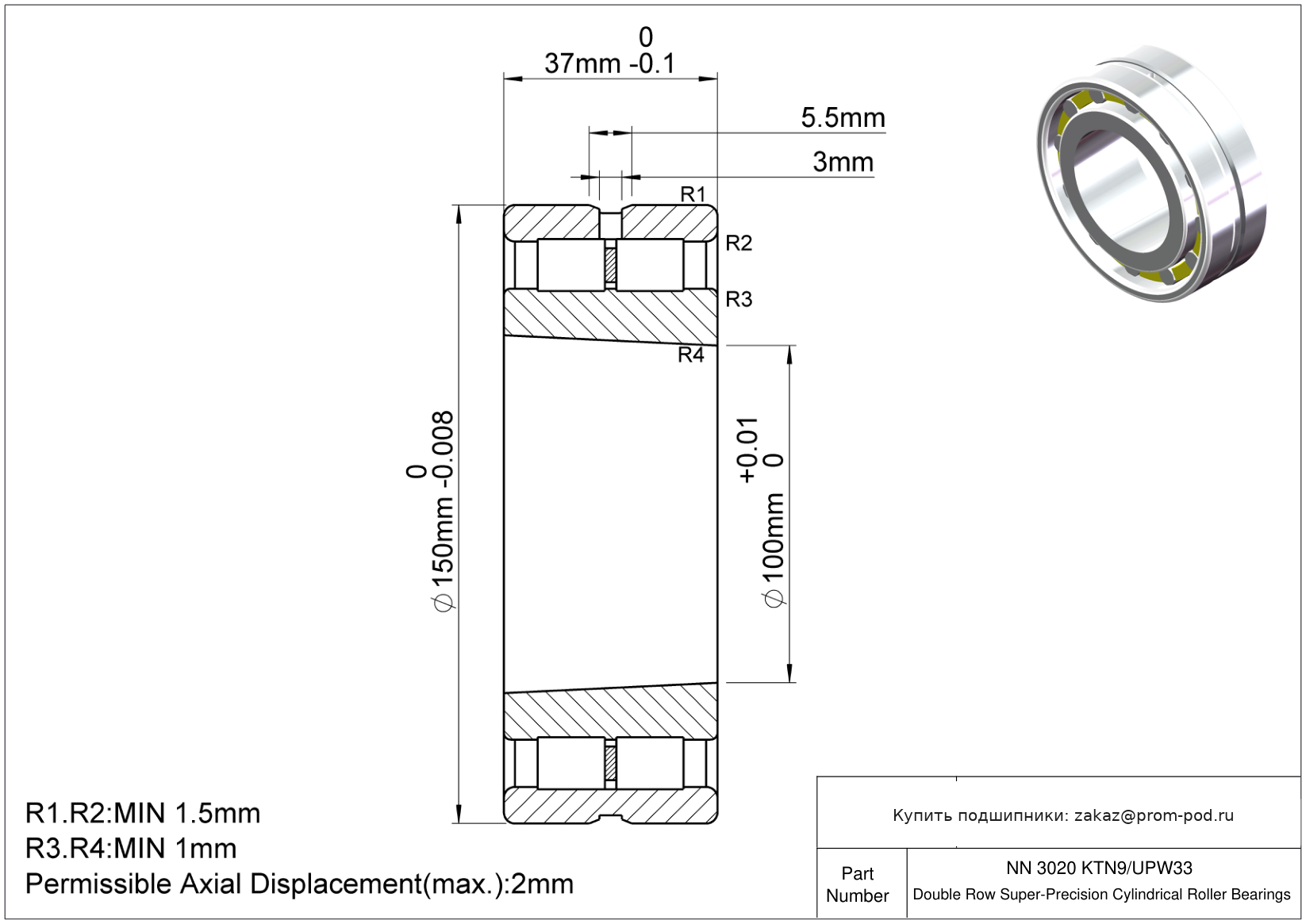 Двухрядный цилиндрический роликоподшипник. Для двухрядных цилиндрических роликоподшипников: канавка для смазки и отверстия для смазки в наружном кольце (зависит от размера подшипника: E, E1, E2, E3, E4). Для сферических роликоподшипников: канавка для смазки и отверстия для смазки в наружном кольце. Класс допуска (FAG) для цилиндрических роликоподшипников, конических роликоподшипников и радиально-упорных шарикоподшипников. Радиальный внутренний зазор: R5 > R4. Литой сепаратор из монолитного спроектированного полимера. Внутренний конструкторский индекс. Коническое отверстие (1:12 по диаметру).