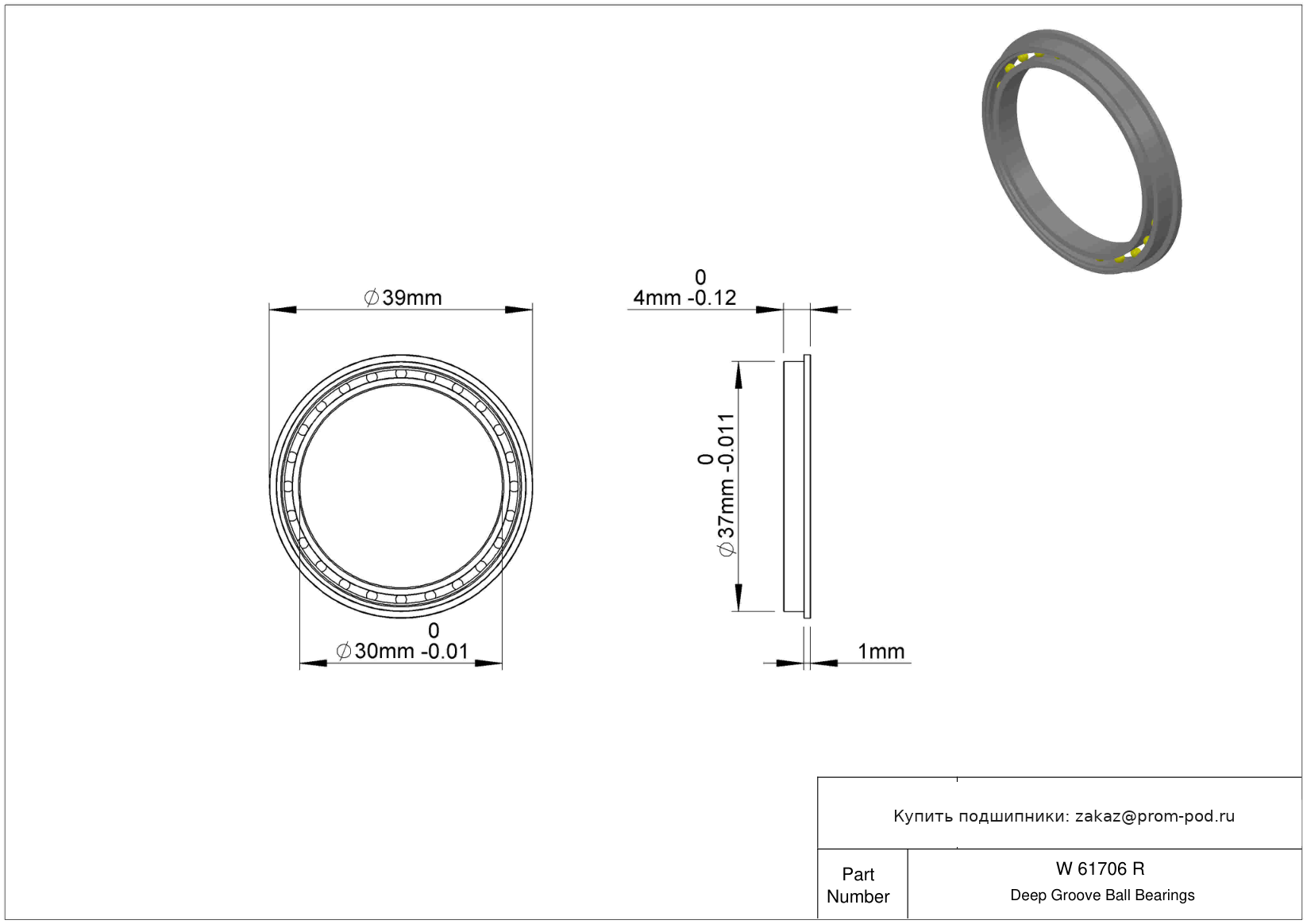 | F6706 2RS | Шариковый подшипник | Стандартное сечение серии для открытых подшипников (.750x.750). Уплотнение с обеих сторон, NBR. |