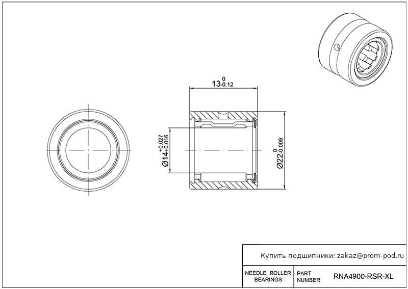 Игольчатый подшипник без внутреннего кольца, смазочное отверстие в наружном кольце. Малошумный. Граничные размеры не соответствуют серии размеров ISO.