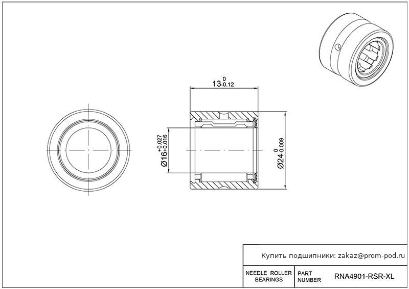 Игольчатый подшипник без внутреннего кольца, смазочное отверстие в наружном кольце. Малошумный. Граничные размеры не соответствуют серии размеров ISO.