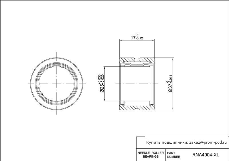 Игольчатый подшипник без внутреннего кольца, смазочное отверстие в наружном кольце. Наружное кольцо с одним ребром, одно стопорное кольцо в I.D. Опускается, если внутреннее кольцо не поставляется.
