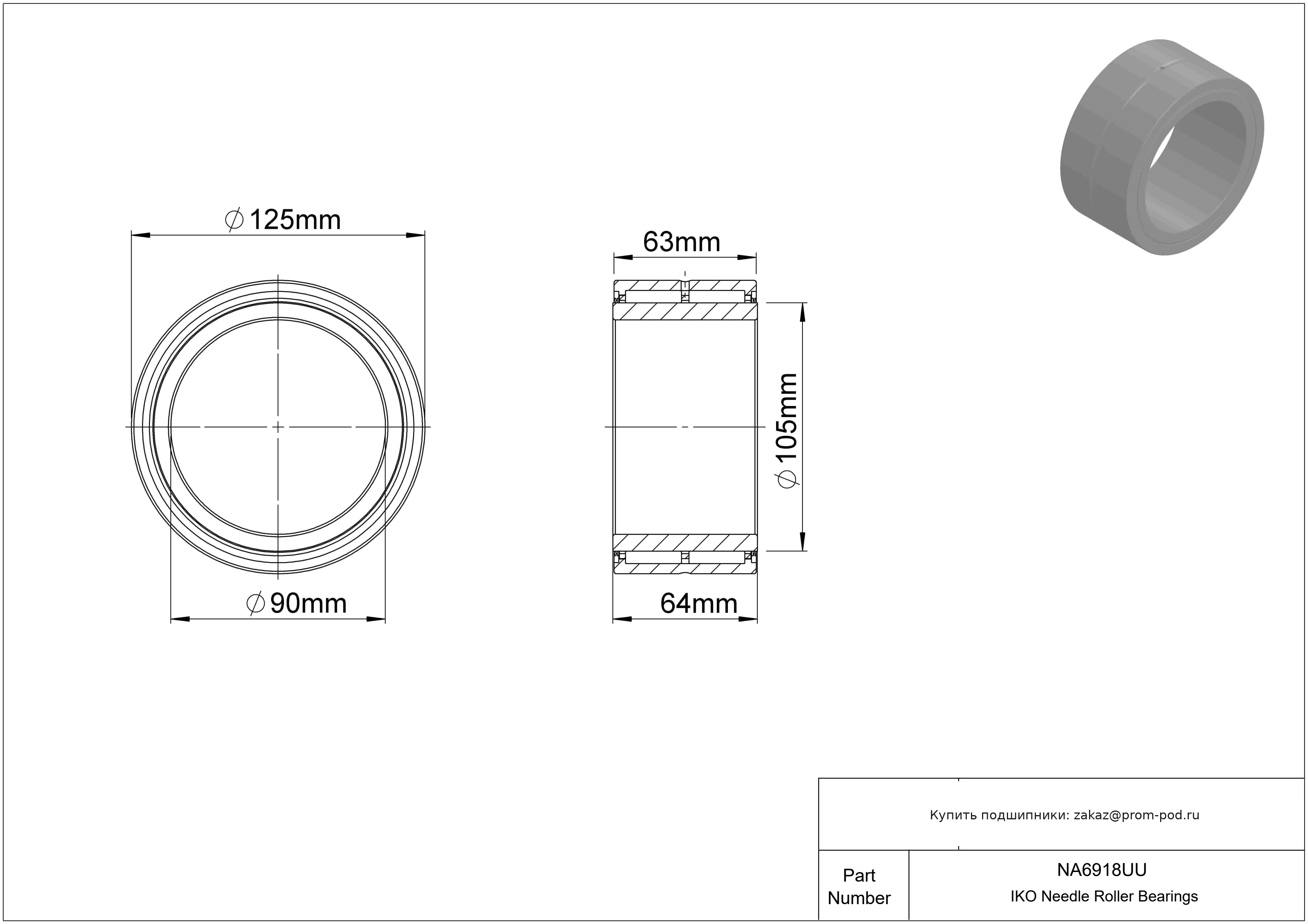 Игольчатый роликоподшипник с механически обработанными кольцами, с бортами и внутренним кольцом. Двухрядный. Малошумный. Граничные размеры не соответствуют серии размеров ISO.