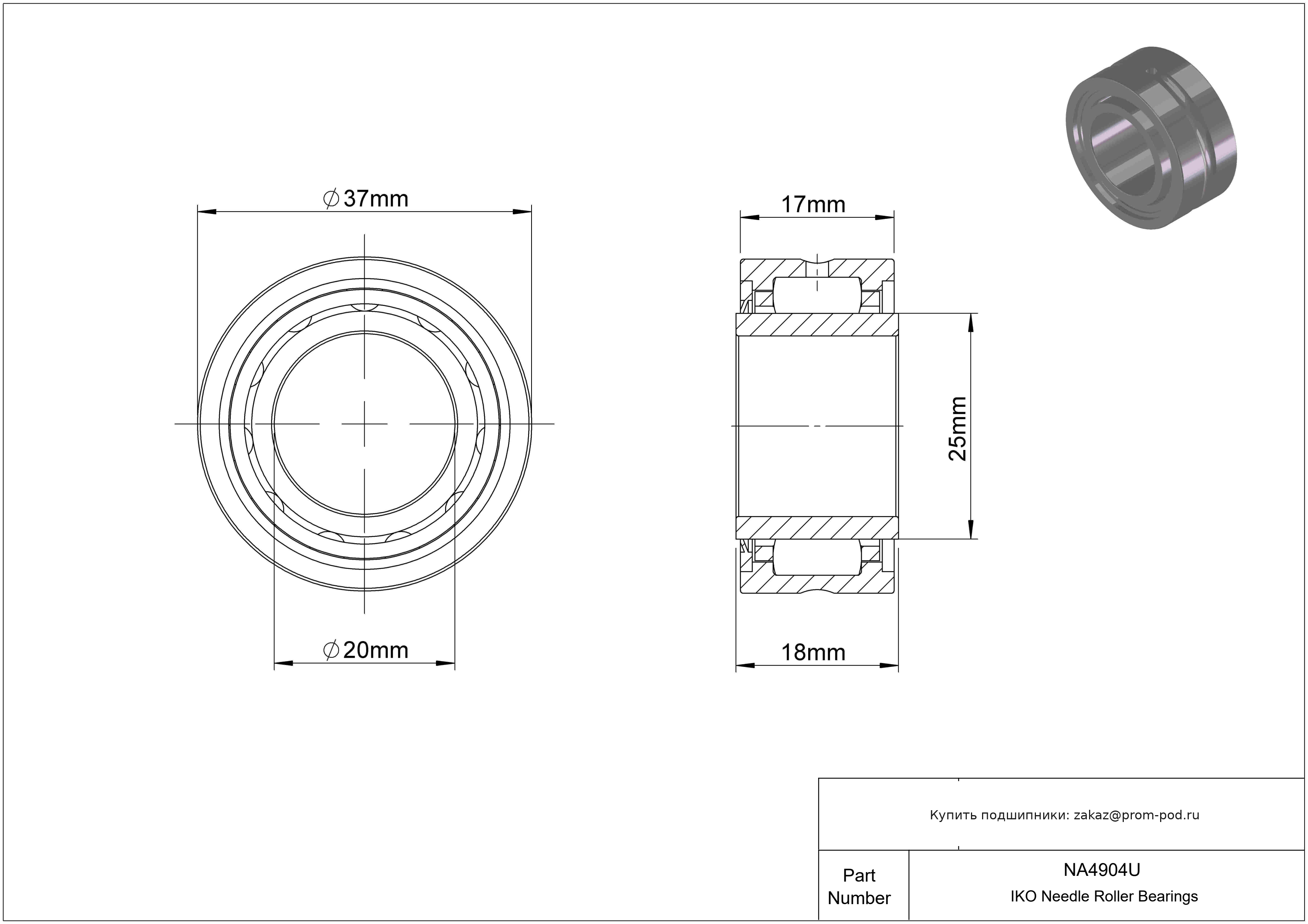 Игольчатый роликоподшипник с механически обработанными кольцами, с бортами и внутренним кольцом. Малошумный. Граничные размеры не соответствуют серии размеров ISO.