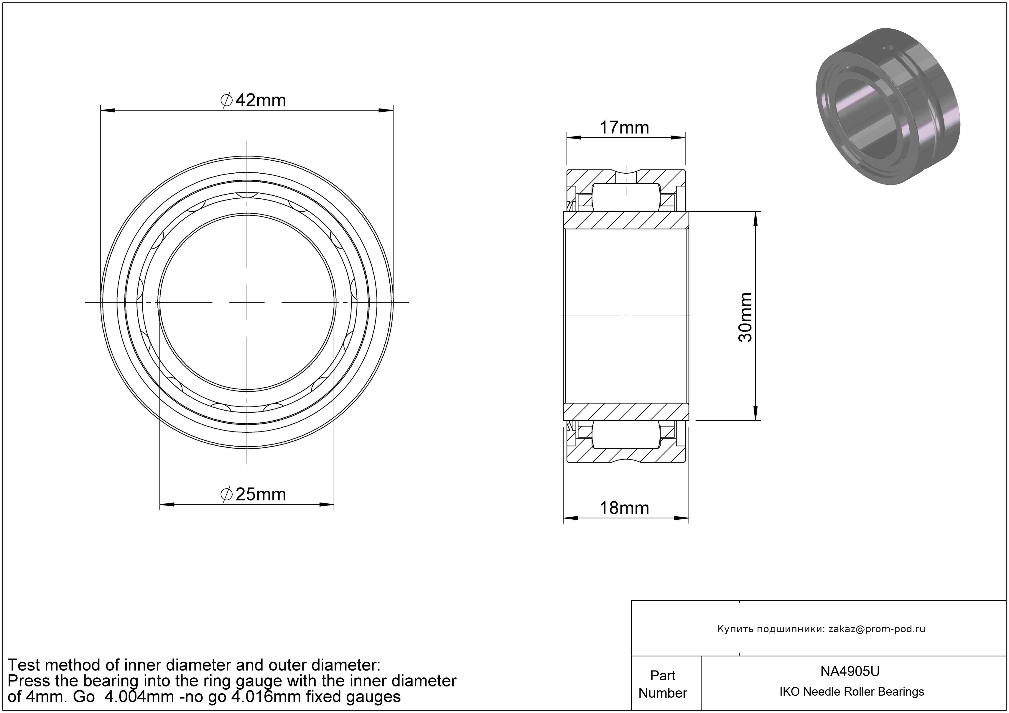 Игольчатый роликоподшипник с механически обработанными кольцами, с бортами и внутренним кольцом. Малошумный. Граничные размеры не соответствуют серии размеров ISO.