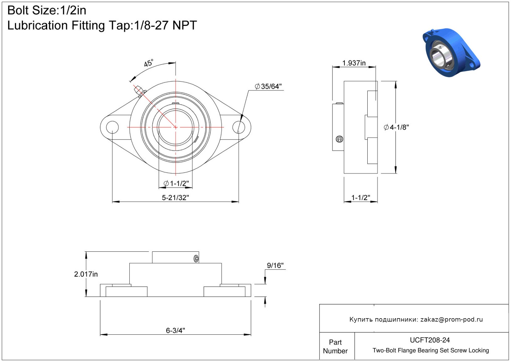 Подшипниковый узел с овальным фланцем, фиксация с помощью установочных винтов.