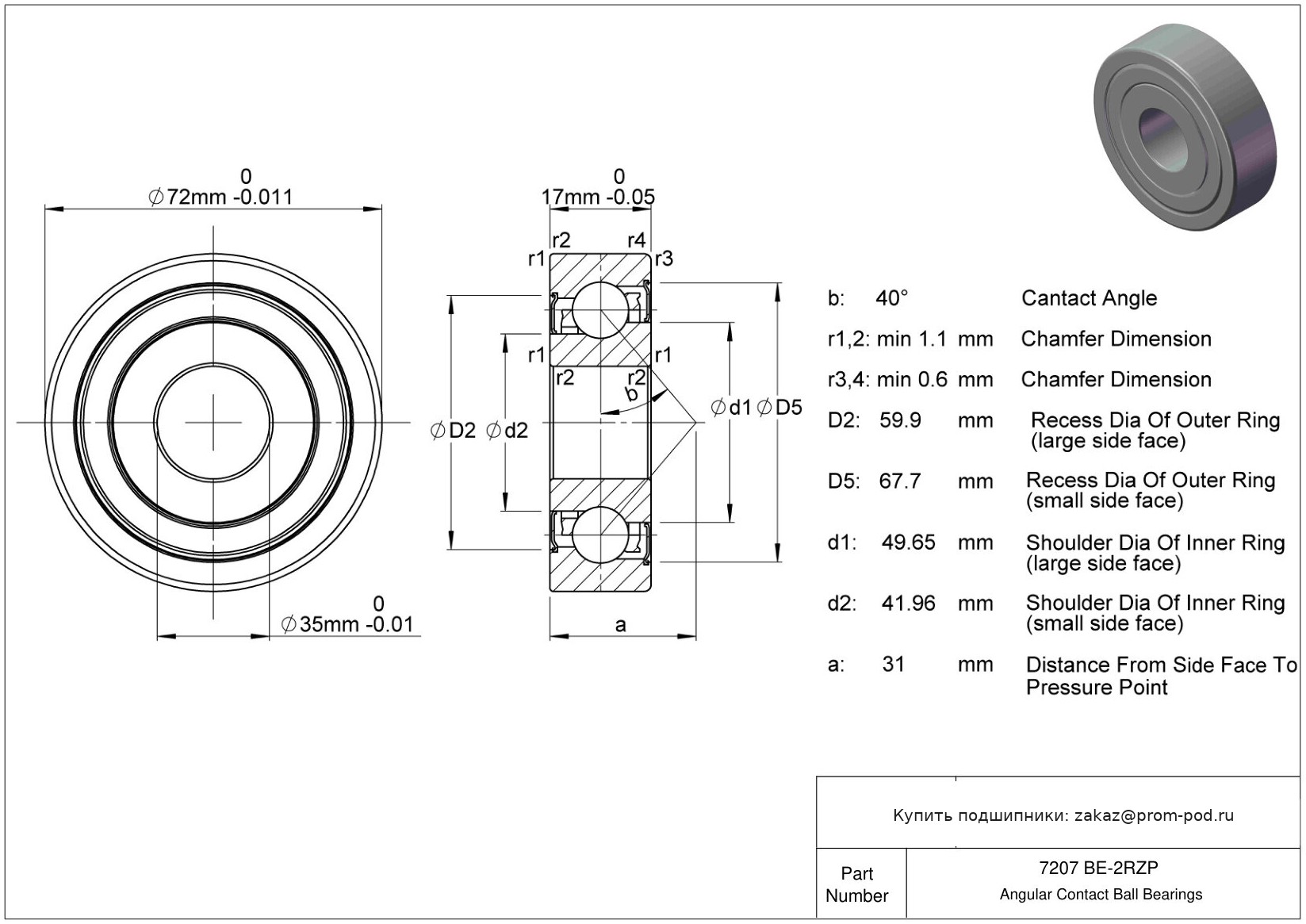 | SS7207 2RS | Радиально-упорный шариковый подшипник | Уплотнение с обеих сторон, NBR. |
