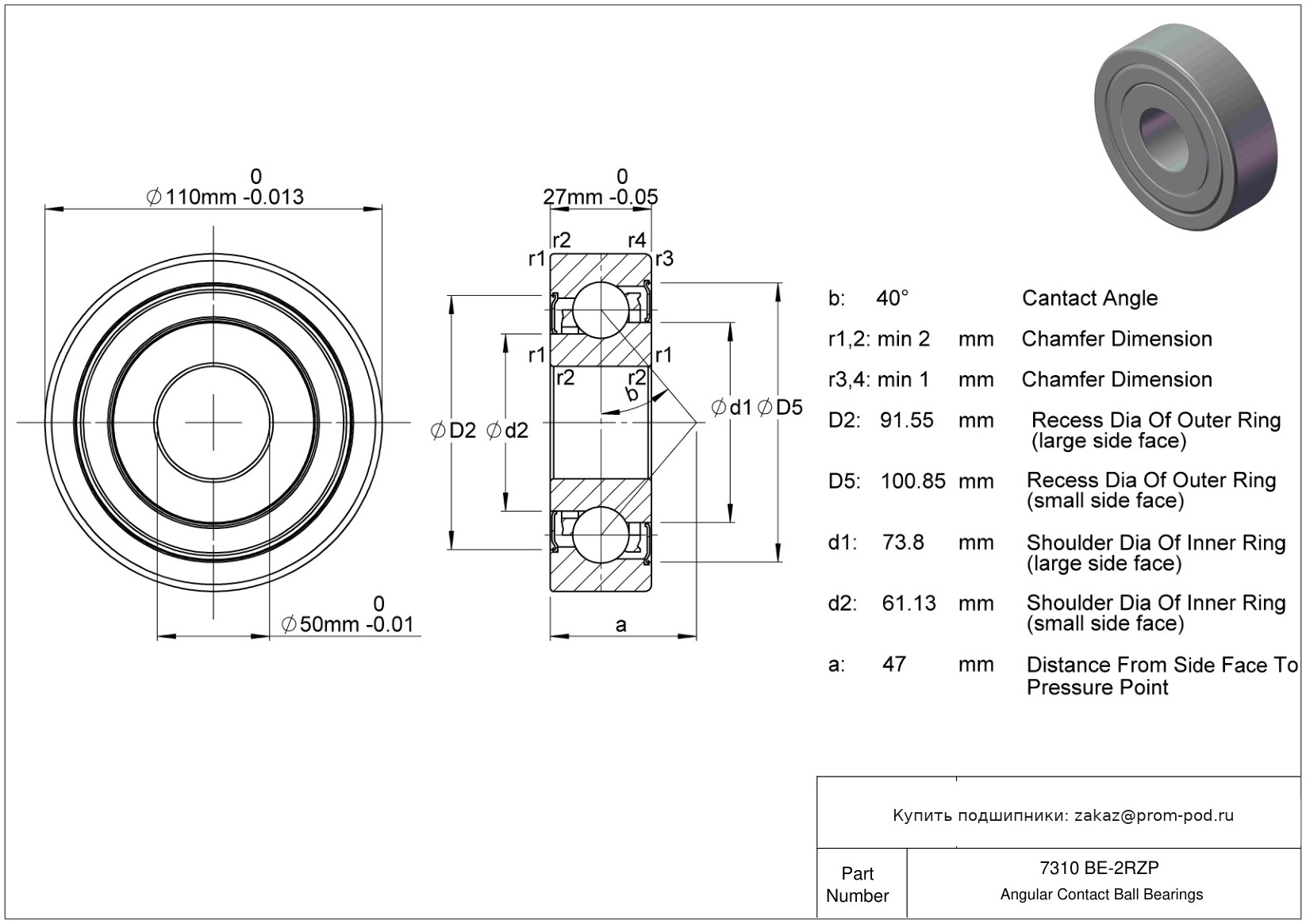 Угол контакта 25 градусов. Контактный угол α=40, усиленная внутренняя конструкция. Обозначение типа смазки. Штампованный латунный сепаратор.