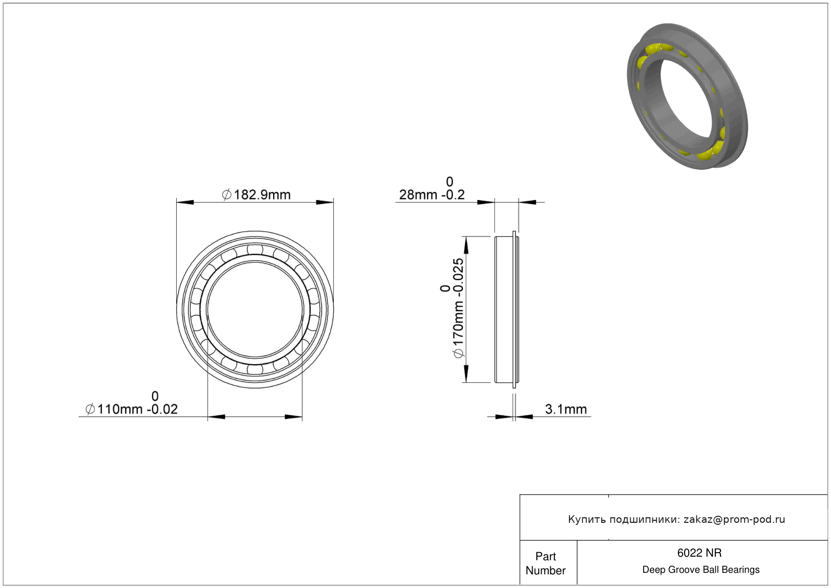 | 6022LLU | Шариковый подшипник | Стандартное контактное нитрильное уплотнение с двух сторон подшипника (от -20 до +120°C). |