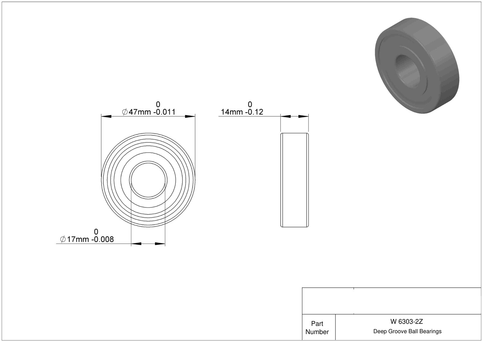 | W 630/3 R-2Z | Шариковый подшипник | Шариковый упорный подшипник, однорядный. Однонаправленный, с рифленой поверхностью качения. Легкая дюймовая серия. Защитная шайба с обеих сторон. Двухрядный шарикоподшипник радиального типа без слота для ввода шариков с литым бронзовым сепаратором пальцевого типа. Углы контакта 0°. |