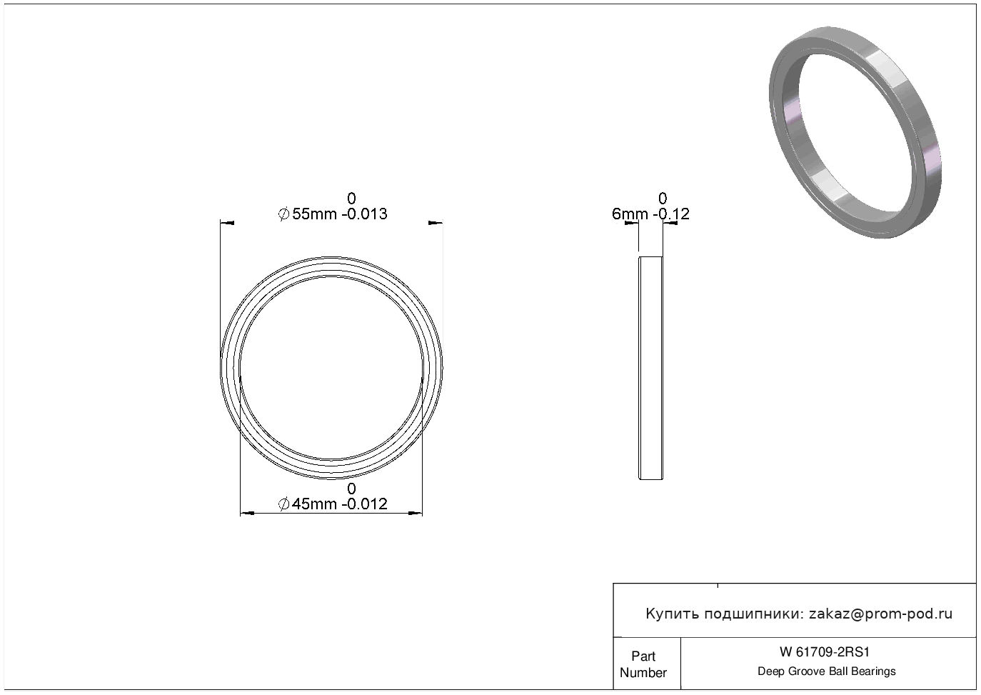| 6709 2RS | Шариковый подшипник | Уплотнение с обеих сторон, NBR. |