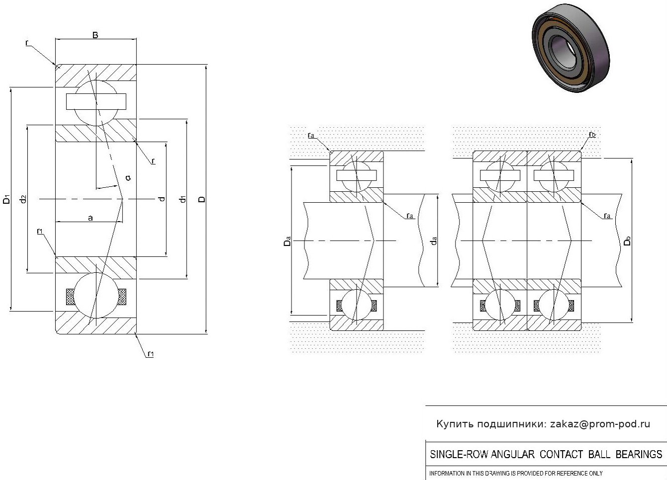 Для двухрядных радиально-упорных шарикоподшипников: подшипник с защитной шайбой, без канавки на внутреннем кольце.