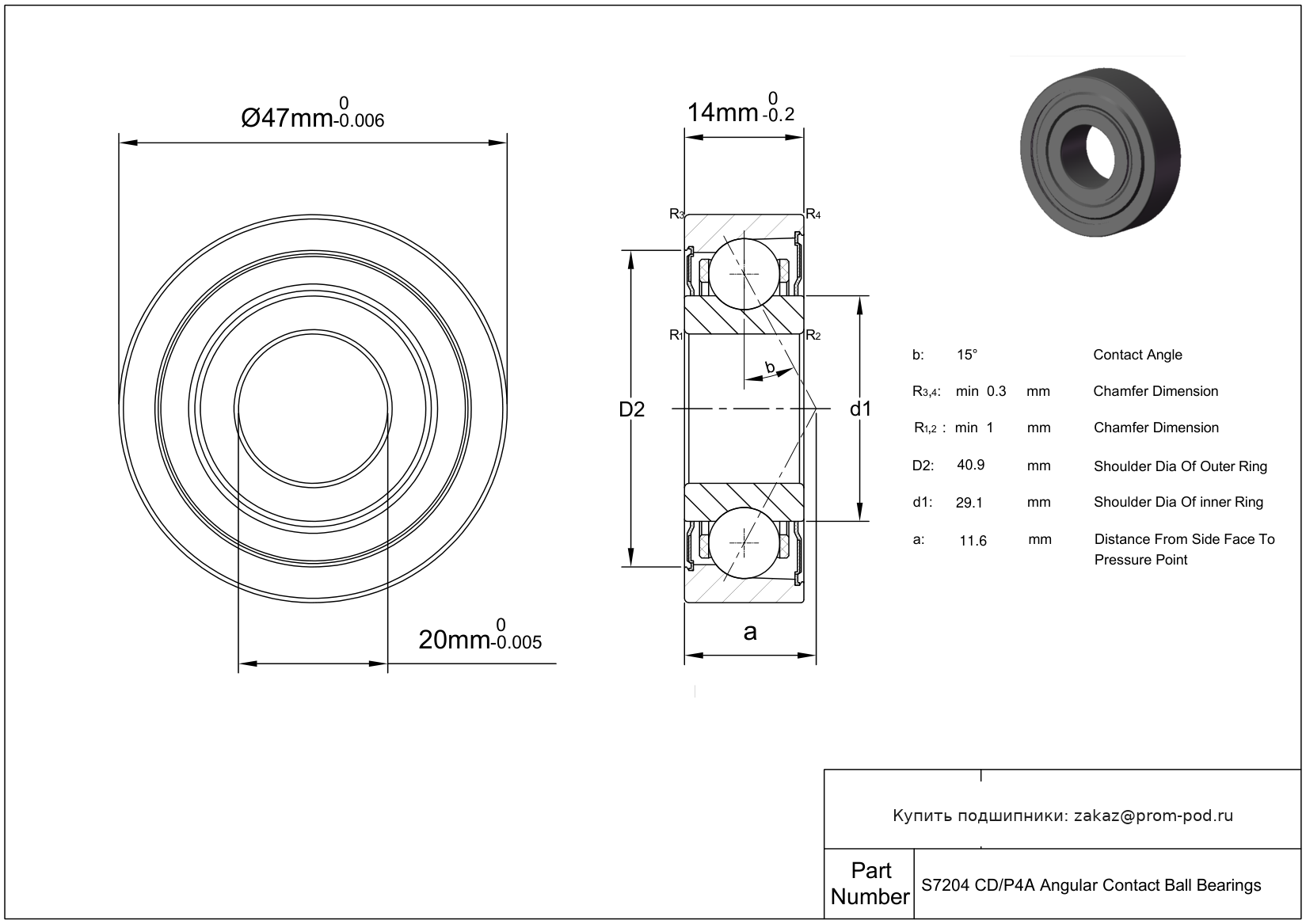 Р4А - специальный класс точности для прецизионных упорных радиальных подшипников - допуски Р4 кроме наружного диаметра. Прецизионный однорядный радиально-упорный шарикоподшипник, угол контакта α=15.