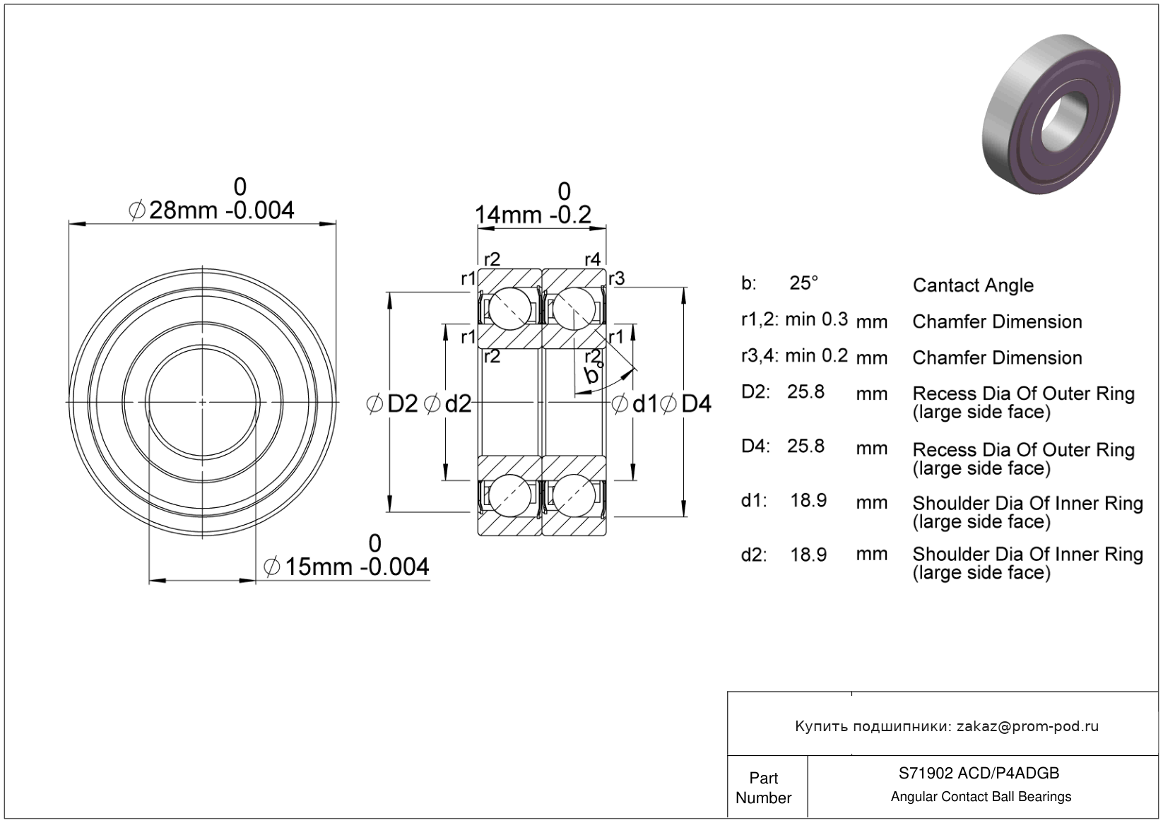 Р4А - специальный класс точности для прецизионных упорных радиальных подшипников - допуски Р4 кроме наружного диаметра. Угол контакта 25 градусов. Дуплекс пара, схема монтажа O спина к спине. Прецизионный однорядный радиально-упорный шарикоподшипник, угол контакта α=15.