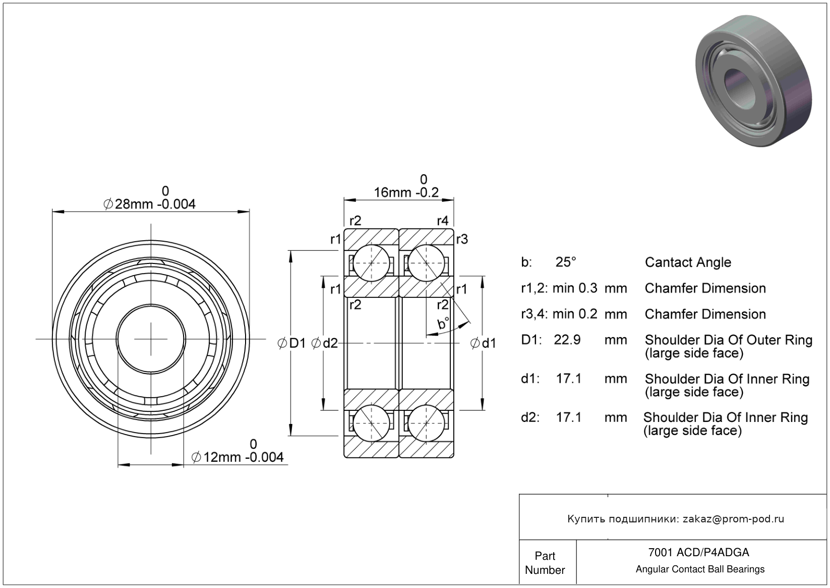 Однорядные радиально-упорные шарикоподшипники с углом контакта α=25. Р4А - специальный класс точности для прецизионных упорных радиальных подшипников - допуски Р4 кроме наружного диаметра. Угол контакта 25 градусов. Дуплекс пара, схема монтажа O спина к спине.