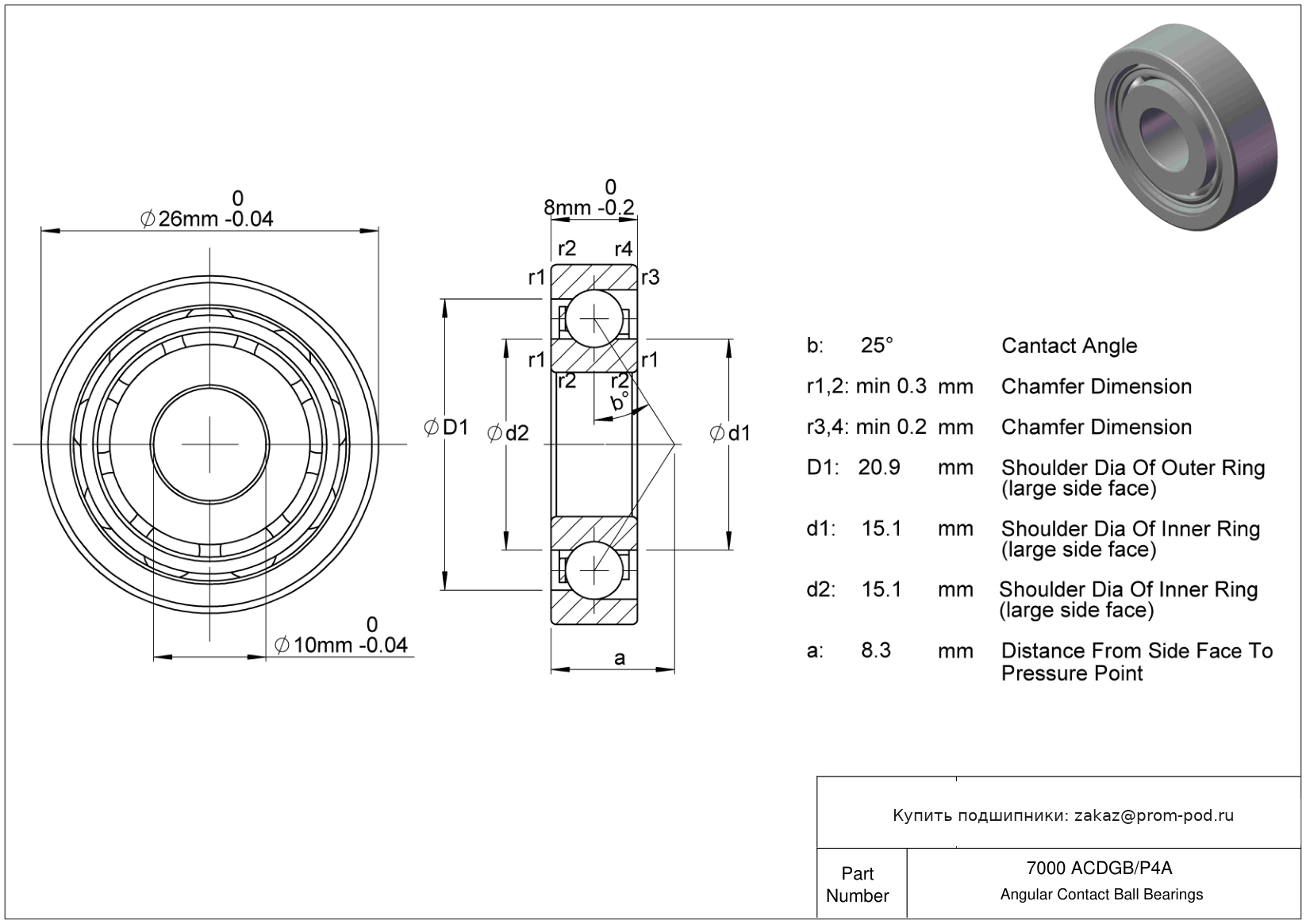 Р4А - специальный класс точности для прецизионных упорных радиальных подшипников - допуски Р4 кроме наружного диаметра. Прецизионный однорядный радиально-упорный шарикоподшипник, угол контакта α=15.