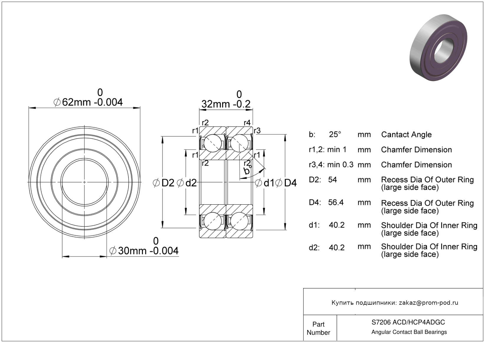 Однорядные радиально-упорные шарикоподшипники с углом контакта α=25. Р4А - специальный класс точности для прецизионных упорных радиальных подшипников - допуски Р4 кроме наружного диаметра. Угол контакта 25 градусов. Дуплекс пара, схема монтажа O спина к спине.