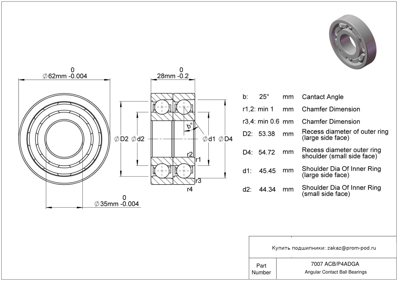 Однорядные радиально-упорные шарикоподшипники с углом контакта α=25. Р4А - специальный класс точности для прецизионных упорных радиальных подшипников - допуски Р4 кроме наружного диаметра. Угол контакта 25 градусов. Дуплекс пара, схема монтажа O спина к спине.