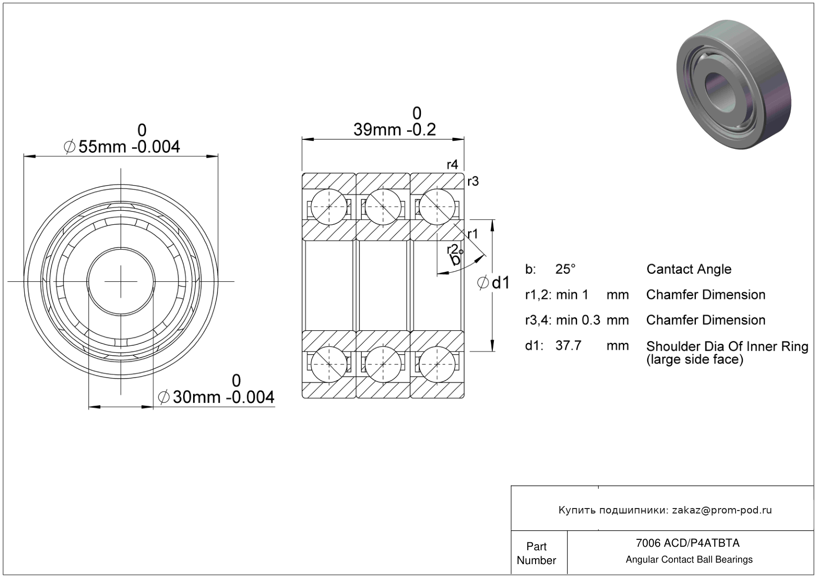 TBT+C. Комплект из трёх взаимно пригнанных однорядных радиальных шарикоподшипников или радиально-упорных шарикоподшипников, устанавливаемых по схеме тандем-О. Обозначение осевого зазора или предварительного натяга такое же, как у DB. Средний преднатяг (серии 719 D, 70 D и 72 D) или Большой преднатяг (серии 718 D, 719 E, 70 E, 719 B и 70 B). Однорядные радиально-упорные шарикоподшипники с углом контакта α=25. Р4А - специальный класс точности для прецизионных упорных радиальных подшипников - допуски Р4 кроме наружного диаметра.