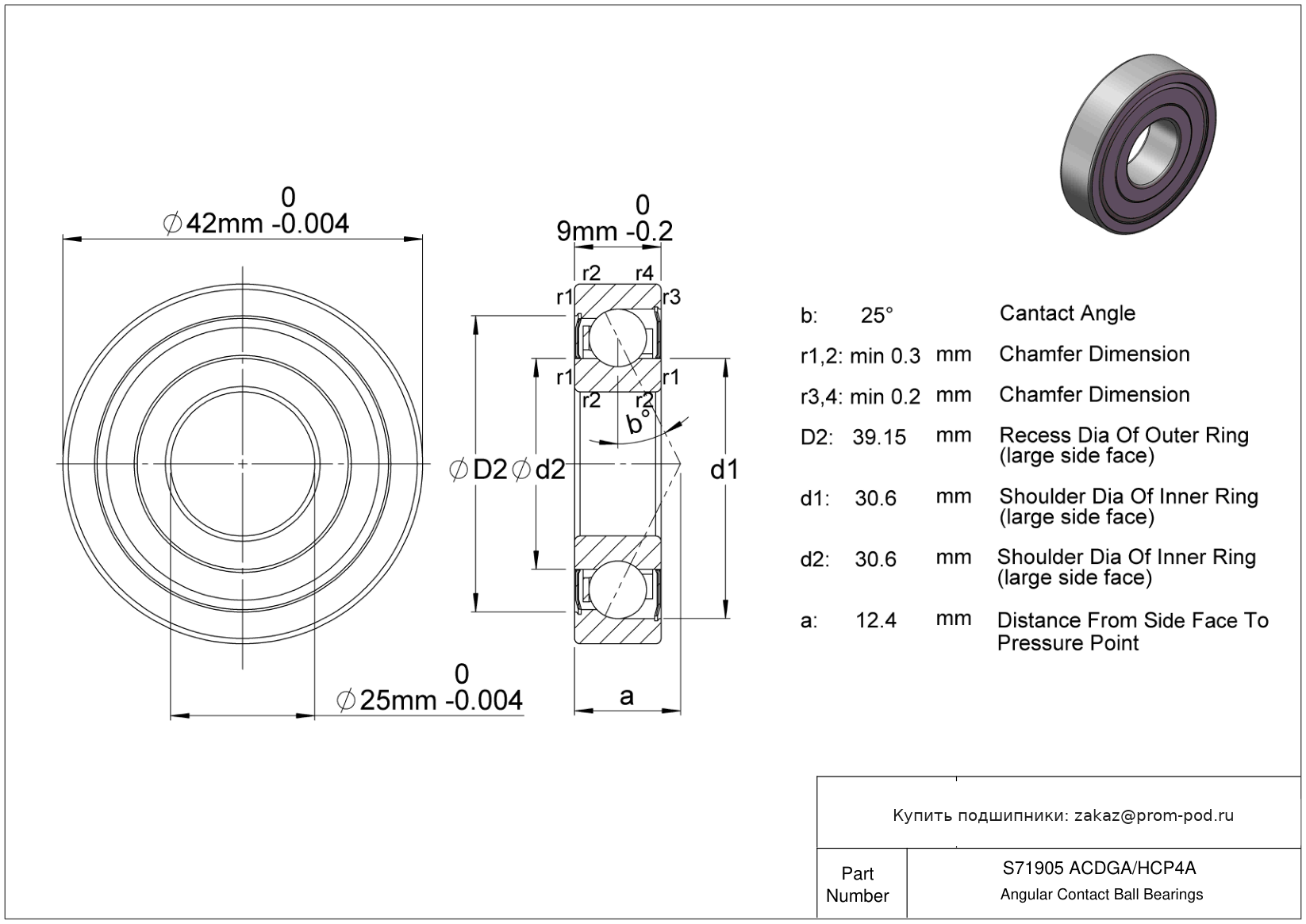 | SS71905 2RS | Радиально-упорный шариковый подшипник | Уплотнение с обеих сторон, NBR. |