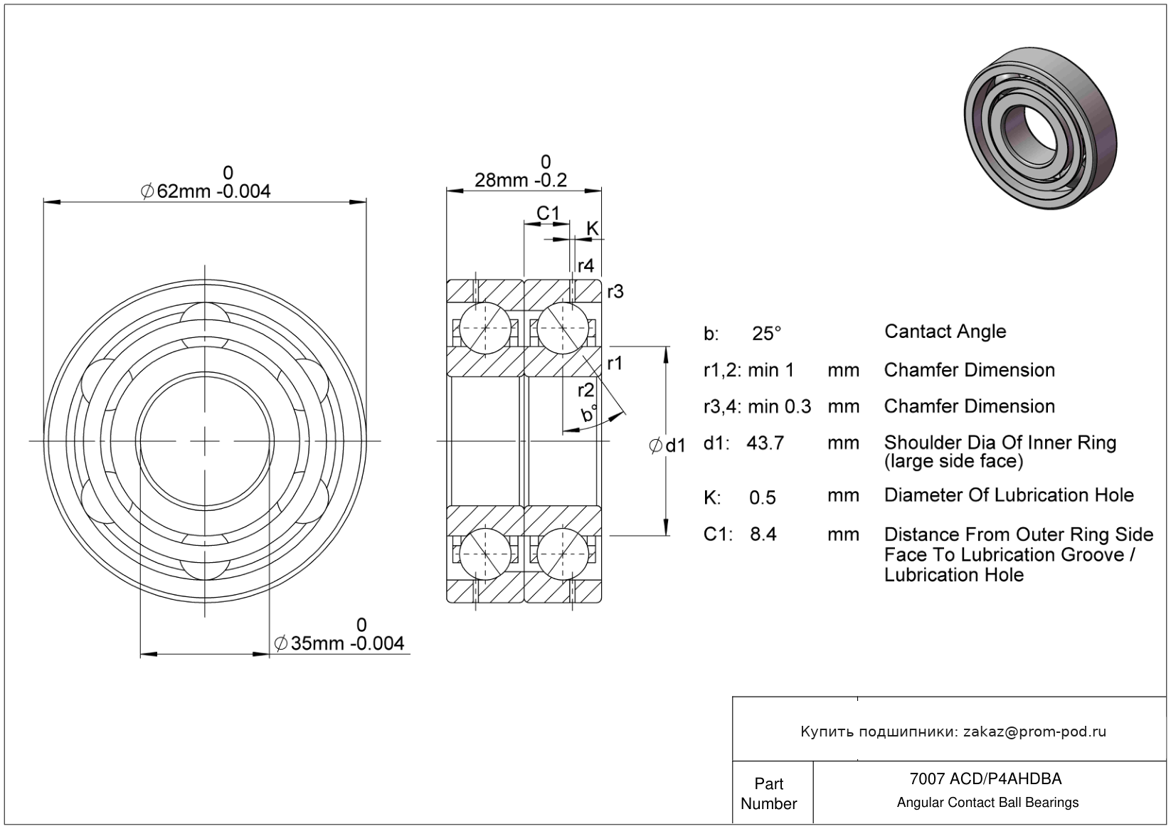 Однорядные радиально-упорные шарикоподшипники с углом контакта α=25. Р4А - специальный класс точности для прецизионных упорных радиальных подшипников - допуски Р4 кроме наружного диаметра. Угол контакта 25 градусов. Дуплекс пара, схема монтажа O спина к спине.