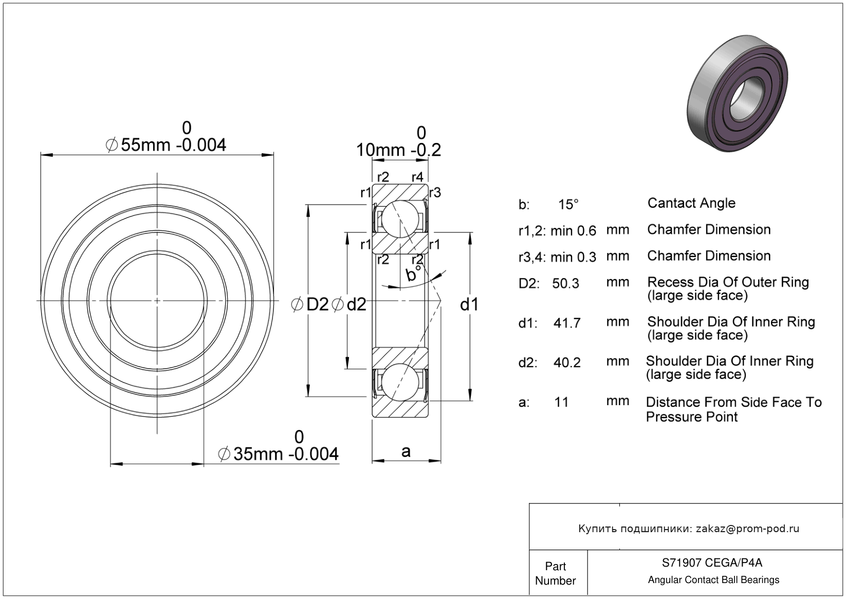 | SS71907 2RS | Радиально-упорный шариковый подшипник | Уплотнение с обеих сторон, NBR. |