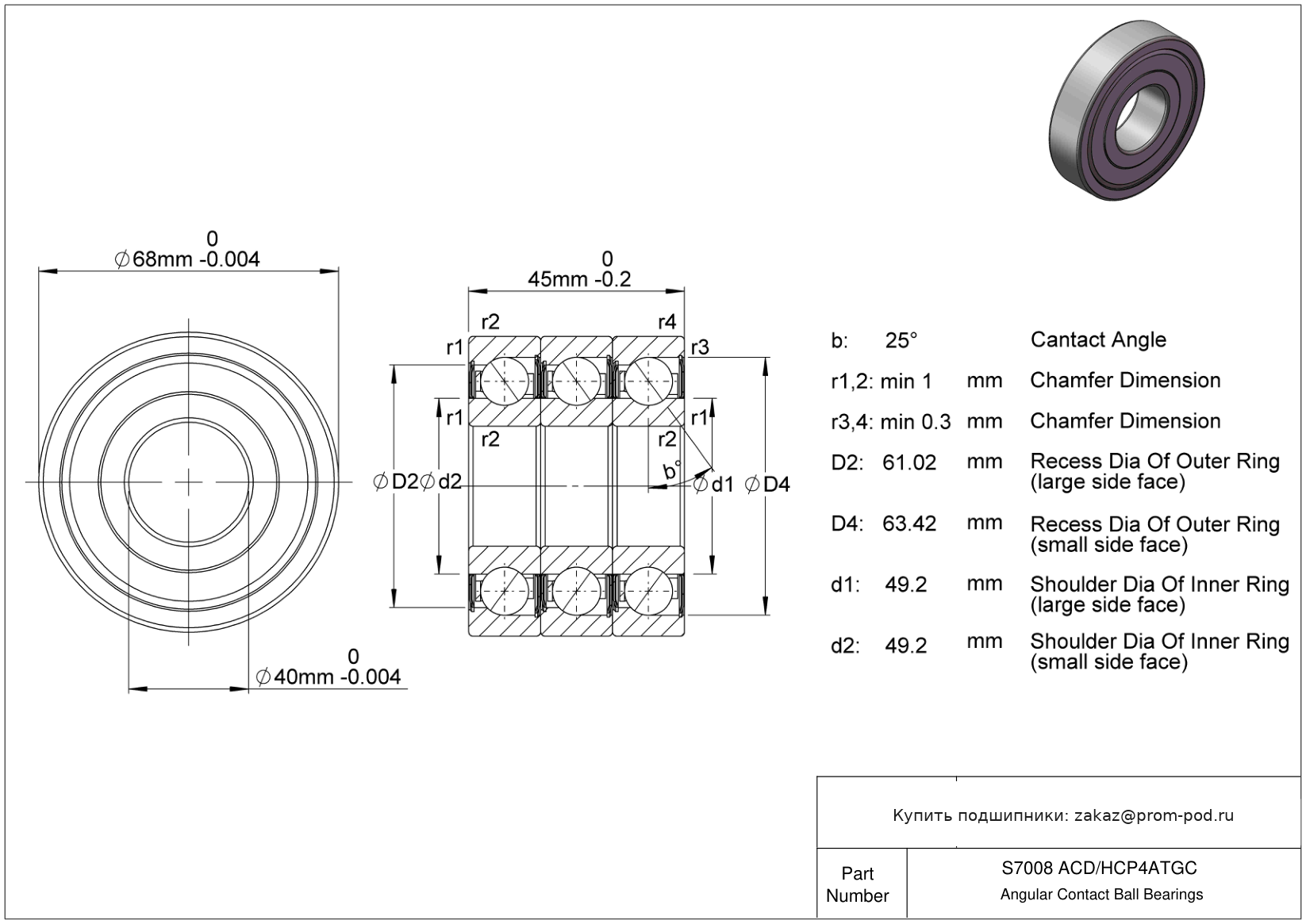 Однорядные радиально-упорные шарикоподшипники с углом контакта α=25. Р4А - специальный класс точности для прецизионных упорных радиальных подшипников - допуски Р4 кроме наружного диаметра. Комплект подшипников шпинделя с 3 подшипниками (триплекс) в тандемной компоновке.