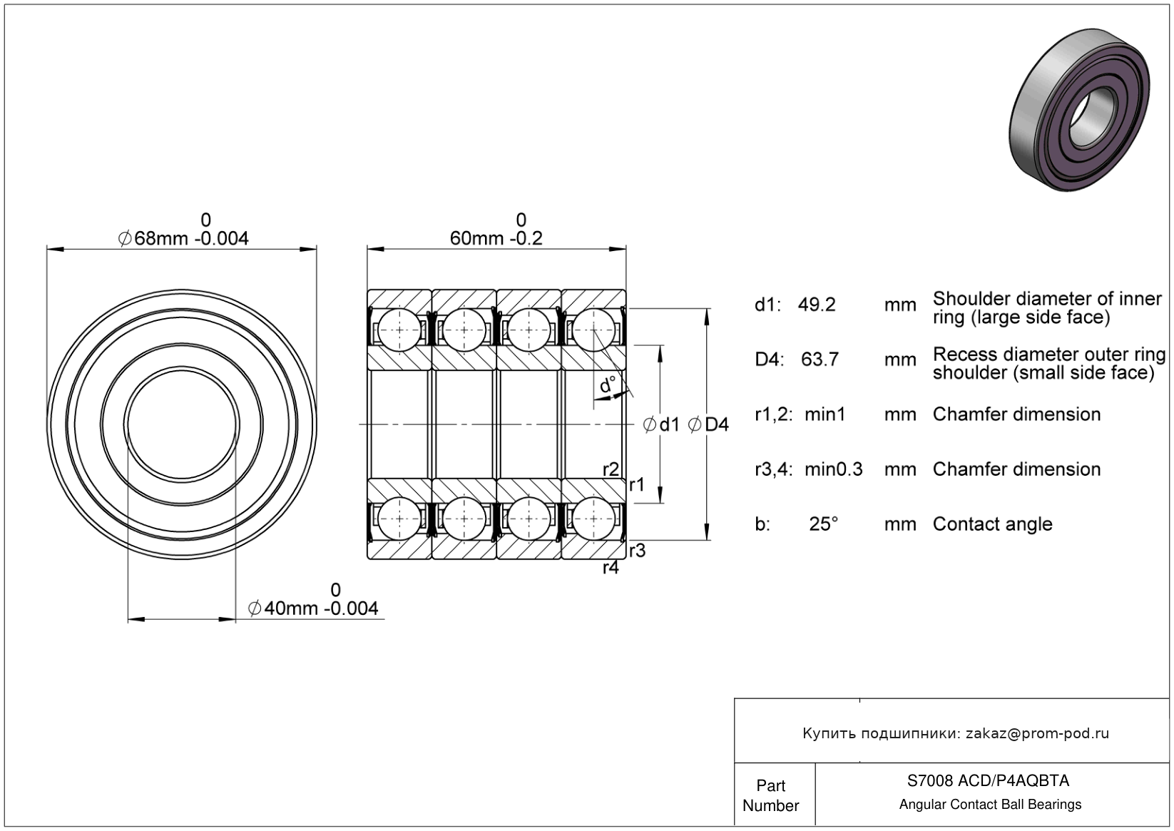 Однорядные радиально-упорные шарикоподшипники с углом контакта α=25. Р4А - специальный класс точности для прецизионных упорных радиальных подшипников - допуски Р4 кроме наружного диаметра. Угол контакта 25 градусов. Комплект тз четырех подшипников для универсальной установки.