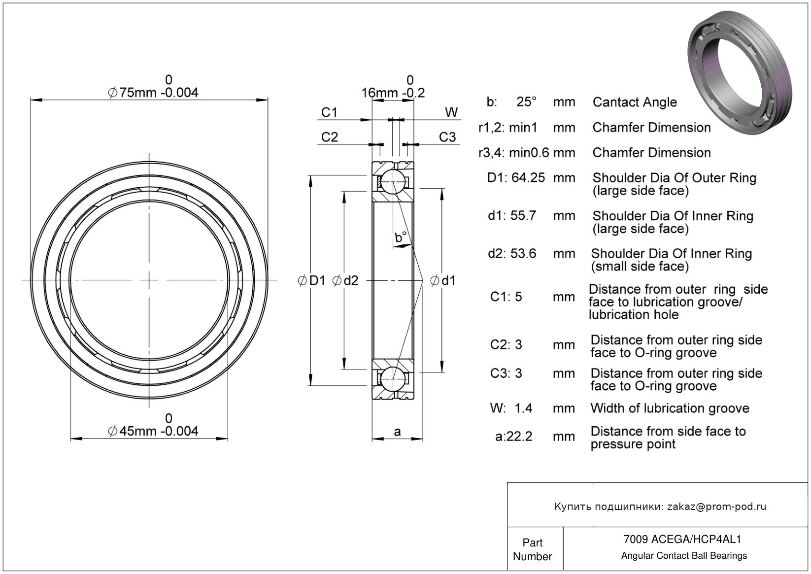 | 6009C | Шариковый подшипник | Двухрядный радиально-упорный шарикоподшипник без слота для ввода шариков, со сходящимися наружу углами контакта, жесткая конструкция. |