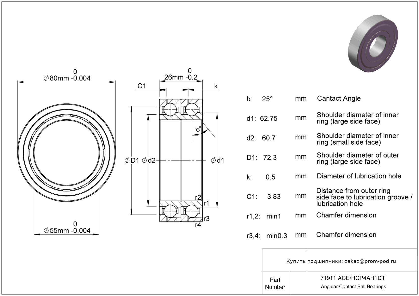 Угол контакта α=25, высокоскоростные, тип E. Р4А - специальный класс точности для прецизионных упорных радиальных подшипников - допуски Р4 кроме наружного диаметра. Угол контакта 25 градусов. Дуплекс пара, схема монтажа O спина к спине. Тела качения из нитрида кремния.