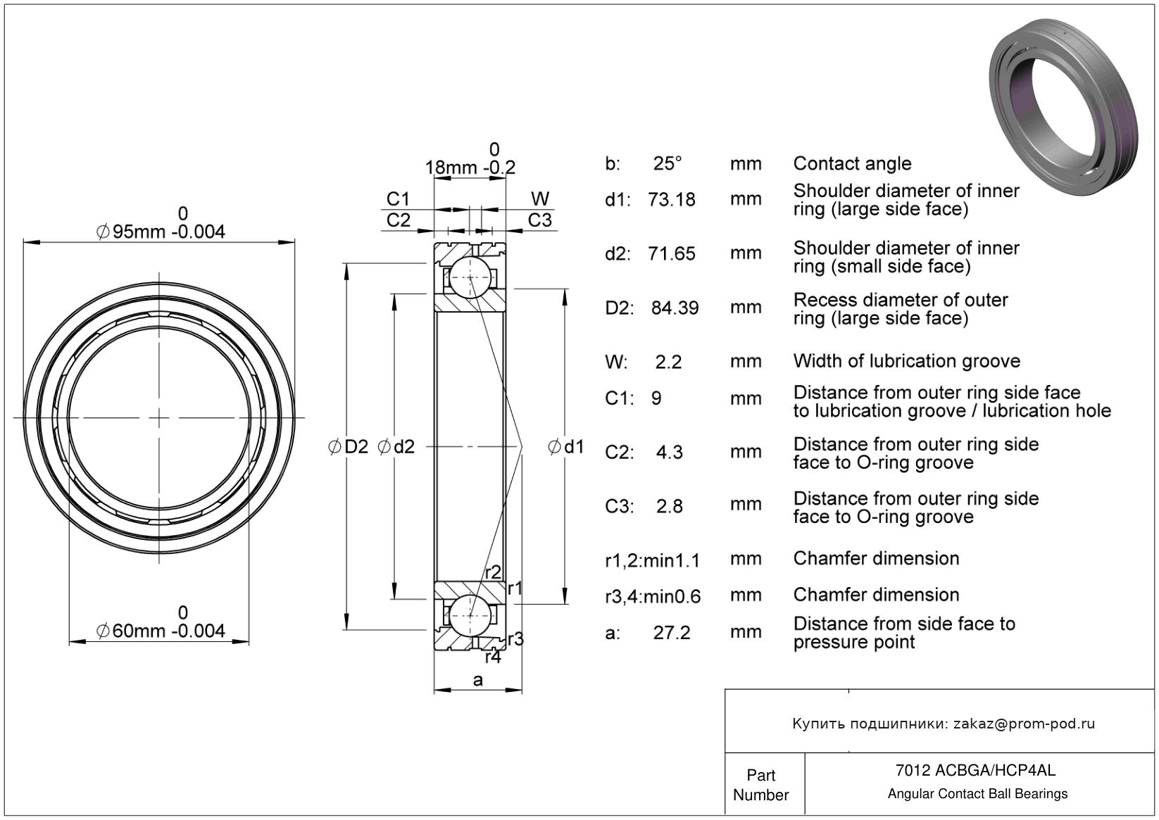Подшипник с контактными уплотнениями с двух сторон, в случае двухрядных радиально-упорных шарикоподшипников - без канавки на внутреннем кольце. Угол контакта 25 градусов. Внутренний зазор больше нормального.