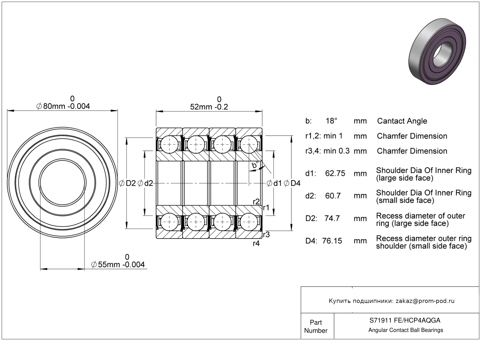 Р4А - специальный класс точности для прецизионных упорных радиальных подшипников - допуски Р4 кроме наружного диаметра. Для универсального монтажа, лёгкий преднатяг (серии 719 D, 70 D и 72 D) или средний преднатяг (серии 718 D, 719 E, 70 E, 719 B и 70 B). Прецизионный однорядный радиально-упорный шарикоподшипник, угол контакта α=15. Тела качения из нитрида кремния. Сепаратор: Стандарт. Подробная информация предоставляется по запросу.