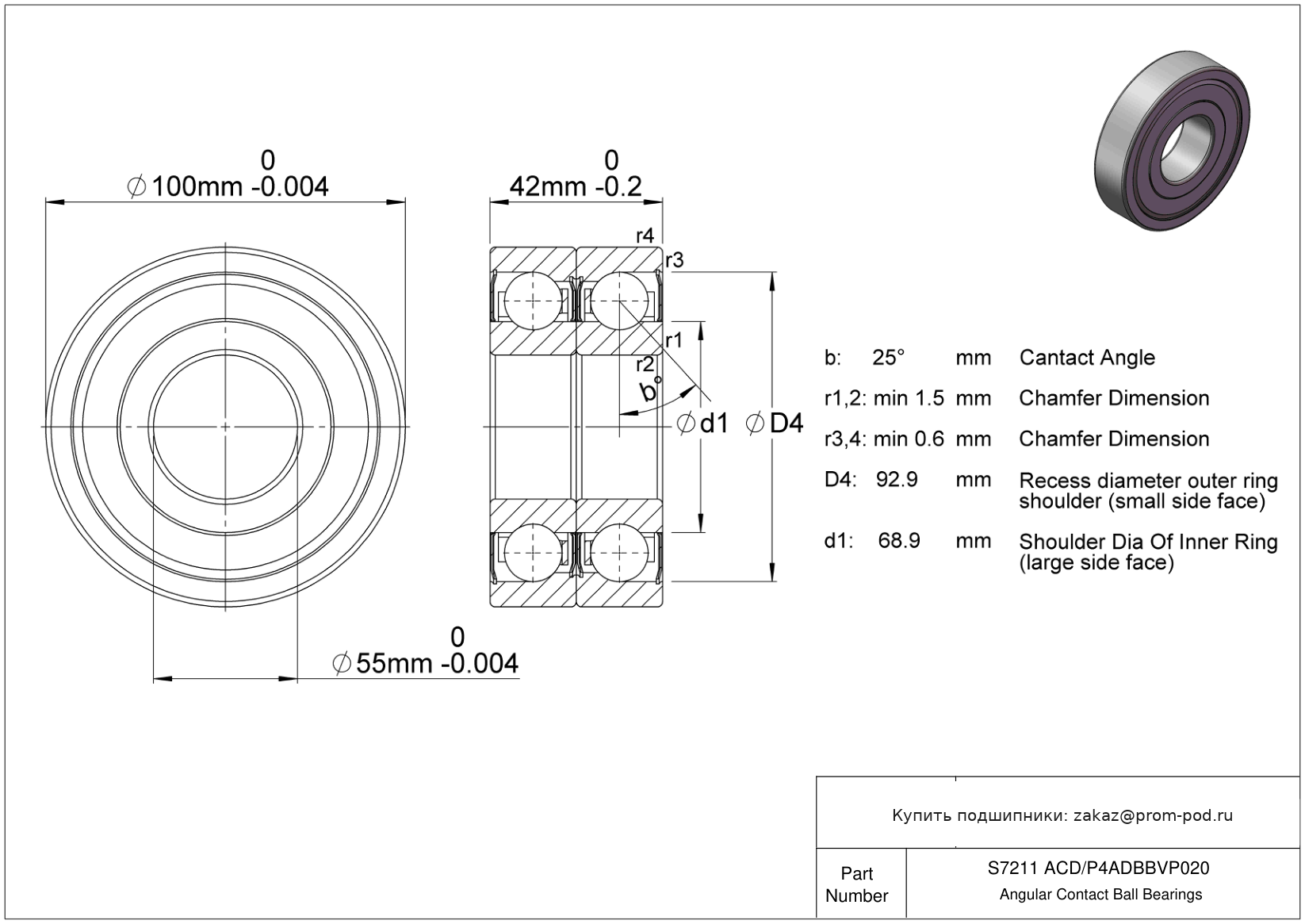 Однорядные радиально-упорные шарикоподшипники с углом контакта α=25. Р4А - специальный класс точности для прецизионных упорных радиальных подшипников - допуски Р4 кроме наружного диаметра. Угол контакта 25 градусов. Дуплекс пара, схема монтажа O спина к спине.