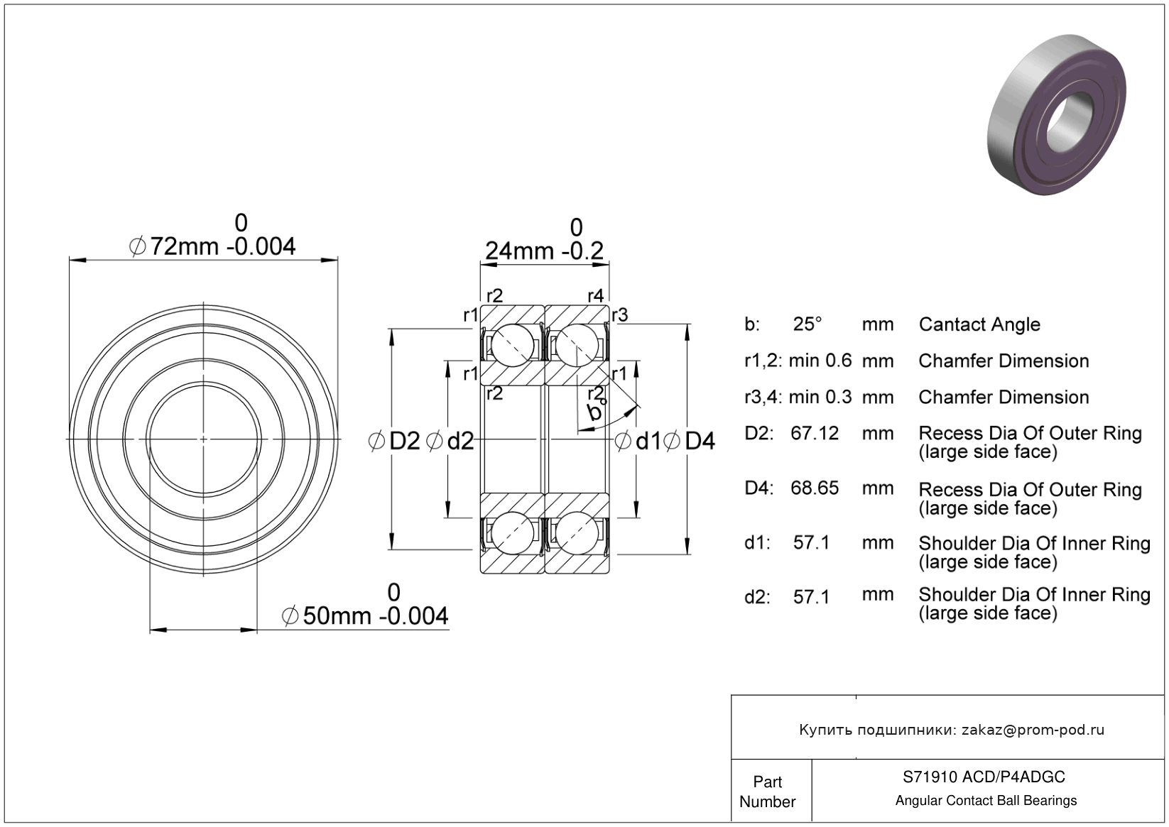 Однорядные радиально-упорные шарикоподшипники с углом контакта α=25. Р4А - специальный класс точности для прецизионных упорных радиальных подшипников - допуски Р4 кроме наружного диаметра. Угол контакта 25 градусов. Дуплекс пара, схема монтажа O спина к спине.
