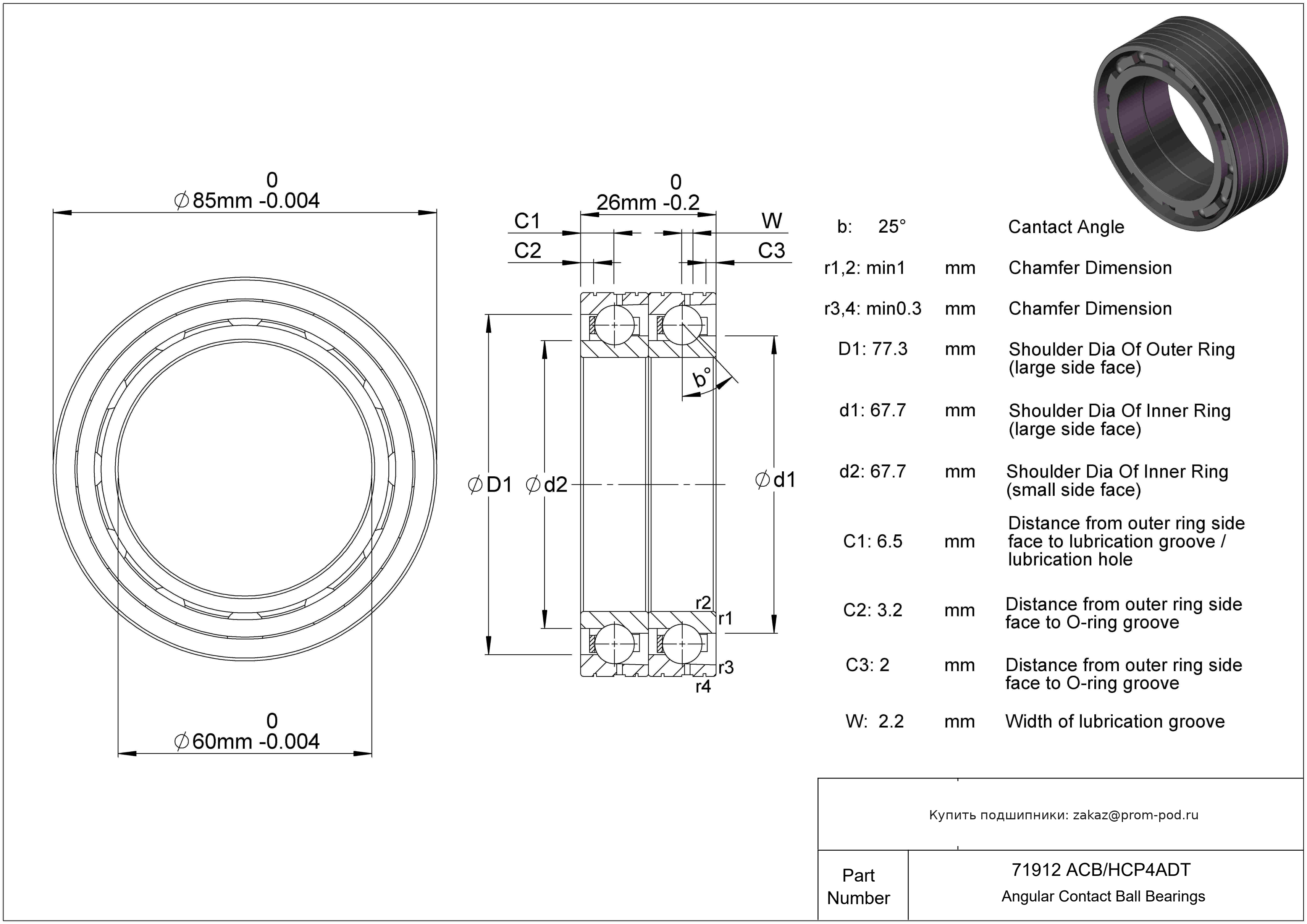 Угол контакта α=25, высокоскоростные, тип E. Р4А - специальный класс точности для прецизионных упорных радиальных подшипников - допуски Р4 кроме наружного диаметра. Угол контакта 25 градусов. Дуплекс пара, схема монтажа O спина к спине.