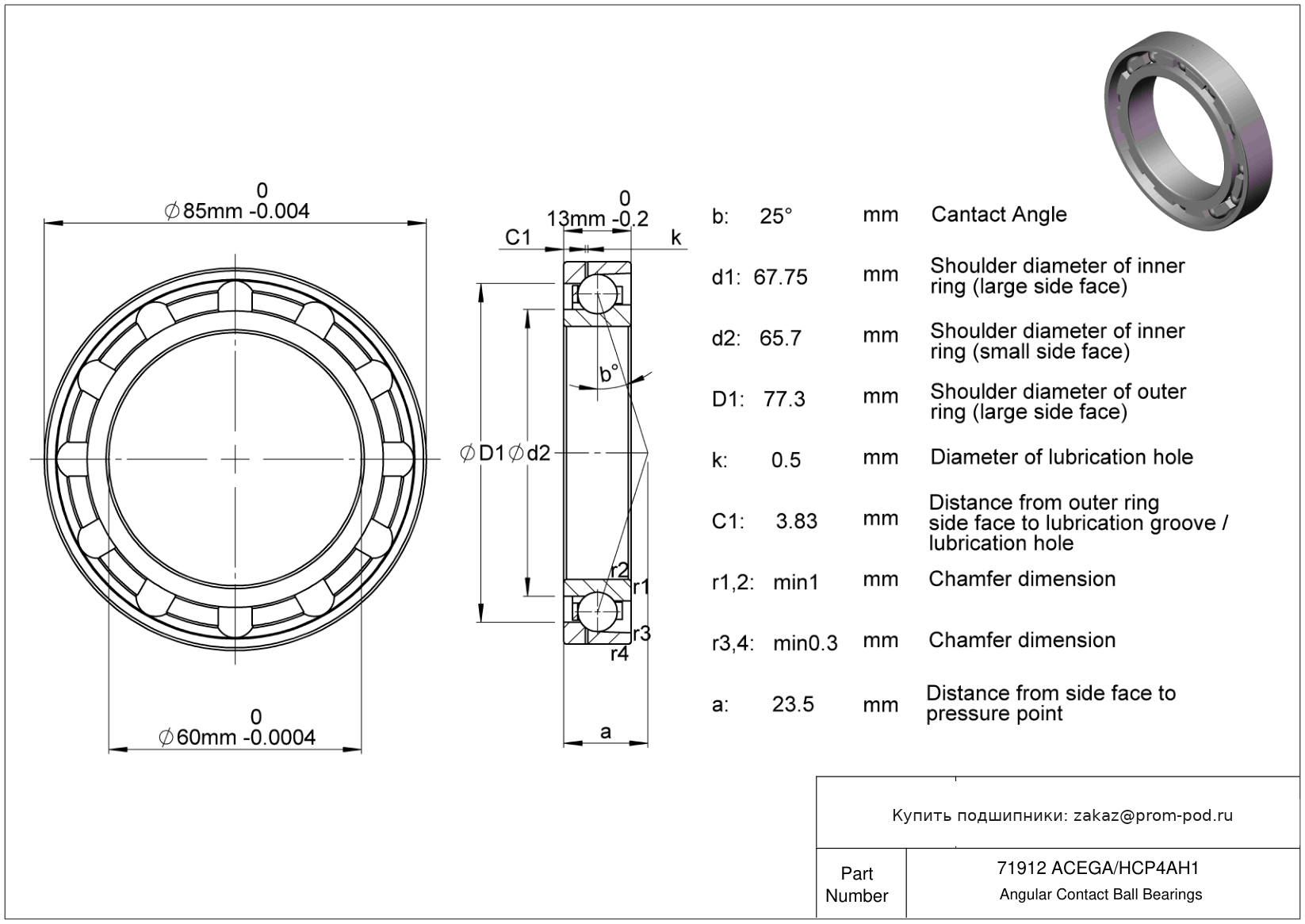 | SS71912 2RS | Радиально-упорный шариковый подшипник | Уплотнение с обеих сторон, NBR. |