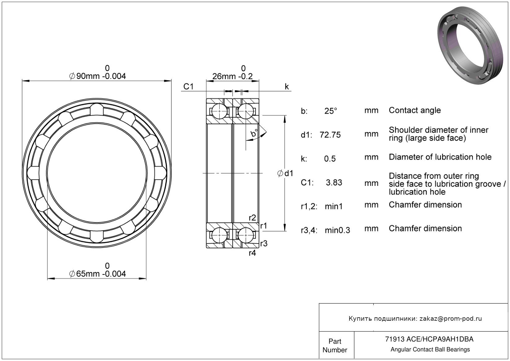 Угол контакта α=25, высокоскоростные, тип E. Р4А - специальный класс точности для прецизионных упорных радиальных подшипников - допуски Р4 кроме наружного диаметра. Угол контакта 25 градусов. Дуплекс пара, схема монтажа O спина к спине. Уменьшенный допуск на монтажный размер H1 (постскриптум: H1 с допуском ± ). Тела качения из нитрида кремния.