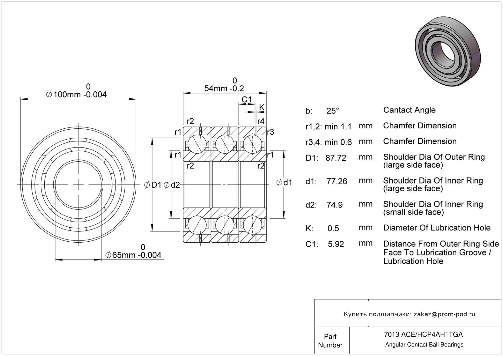 Шарики и кольца из материала AISI 440C. TBT+B.Комплект из трёх взаимно пригнанных однорядных радиальных шарикоподшипников или радиально-упорных шарикоподшипников, устанавливаемых по схеме тандем-О. Обозначение осевого зазора или предварительного натяга такое же, как у DB. Лёгкий преднатяг (серии 719 D, 70 D и 72 D) или Средний преднатяг (серии 718 D, 719 E, 70 E, 719 B и 70 B). Однорядные радиально-упорные шарикоподшипники с углом контакта α=25. Р4А - специальный класс точности для прецизионных упорных радиальных подшипников - допуски Р4 кроме наружного диаметра.