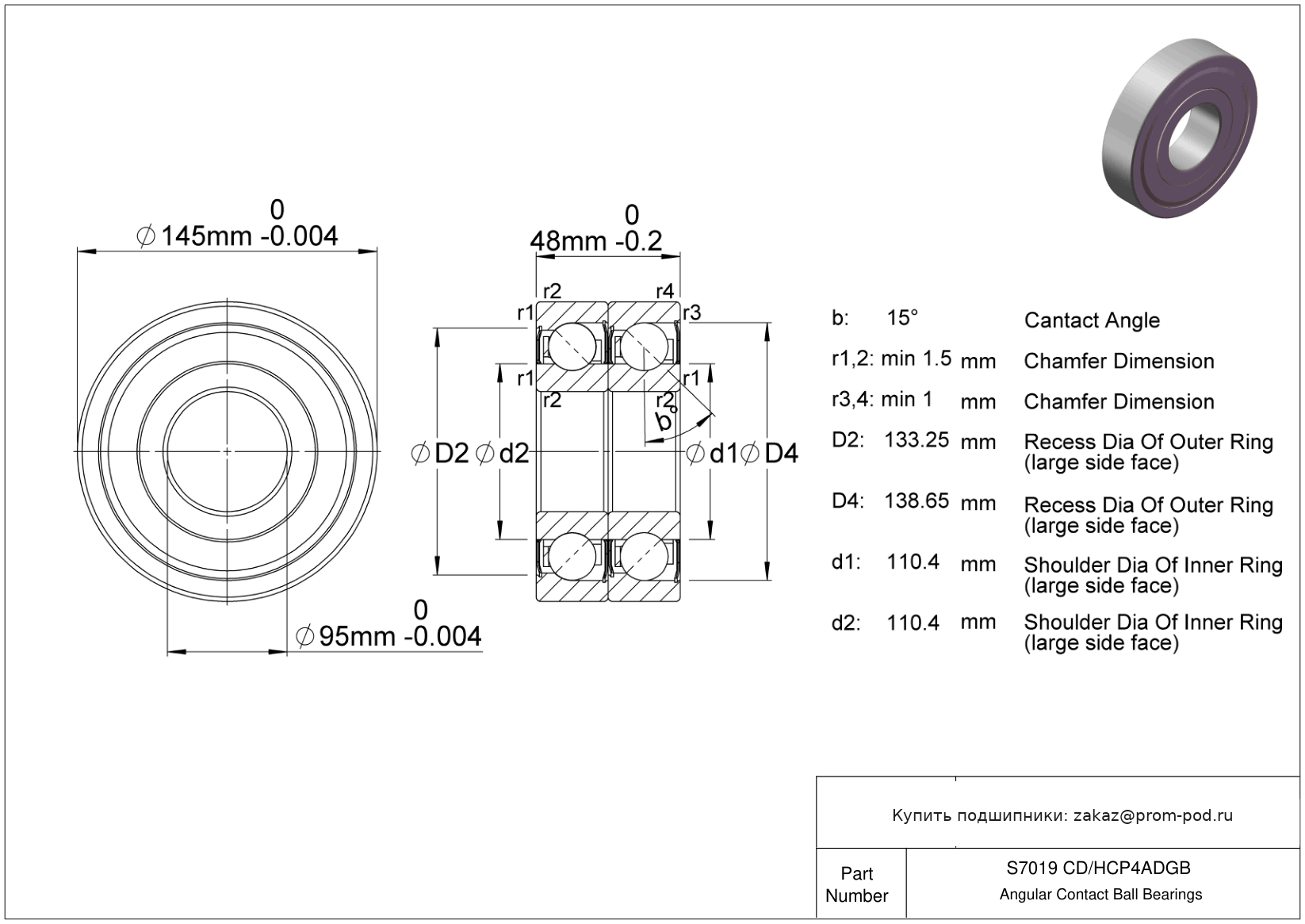 Однорядные радиально-упорные шарикоподшипники с углом контакта α=25. Р4А - специальный класс точности для прецизионных упорных радиальных подшипников - допуски Р4 кроме наружного диаметра. Угол контакта 25 градусов. Дуплекс пара, схема монтажа O спина к спине.