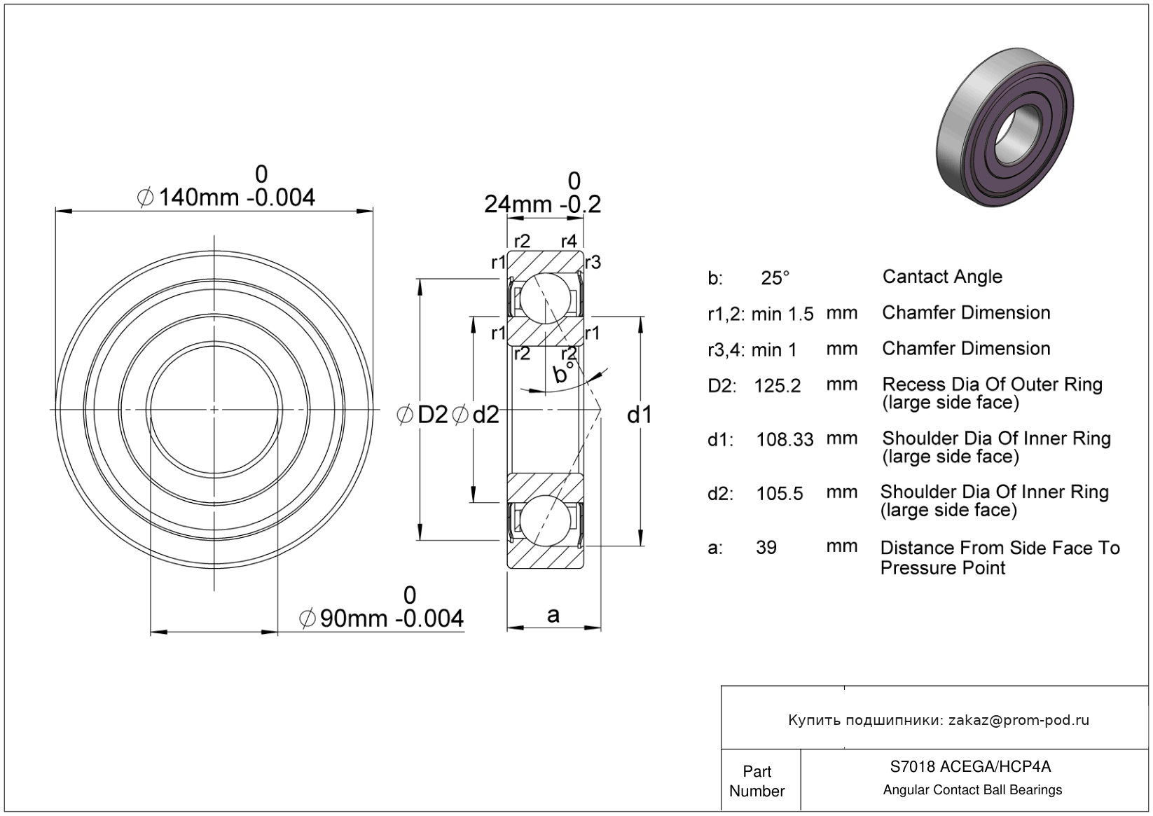 | SS7018 2RS | Радиально-упорный шариковый подшипник | Уплотнение с обеих сторон, NBR. |