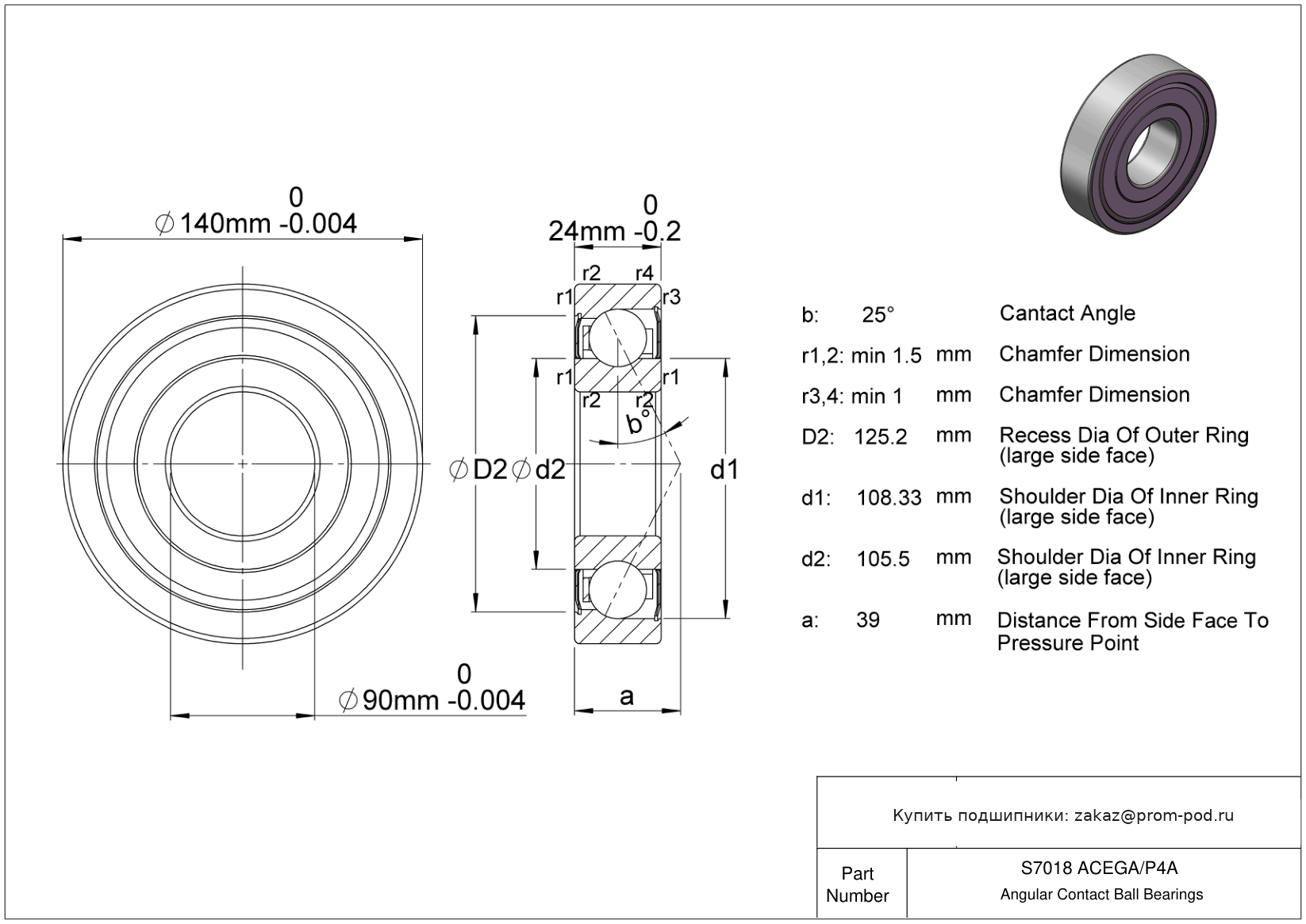 | SS7018 2RS | Радиально-упорный шариковый подшипник | Уплотнение с обеих сторон, NBR. |