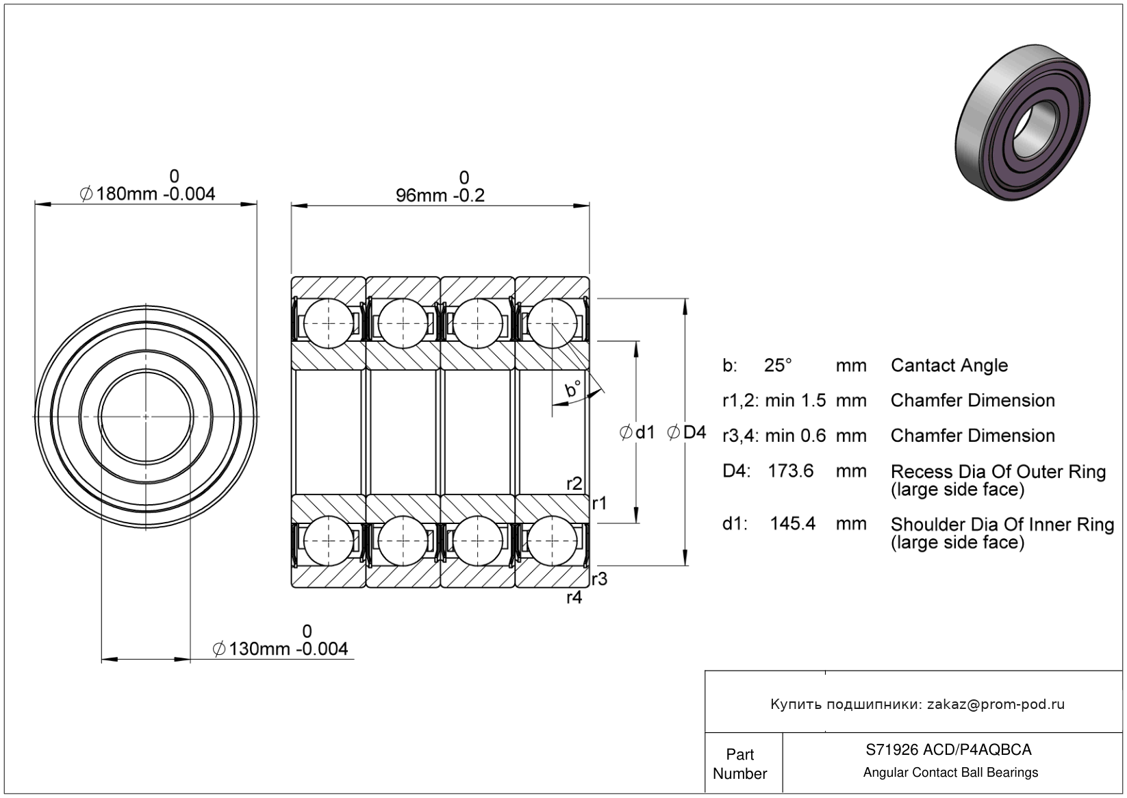 QBC+C. Комплект из четырёх взаимно пригнанных однорядных радиальных шарикоподшипников или радиально-упорных шарикоподшипников. Две пары подшипников, установленныхпо схеме тандем, составляются в комплект по 0-образной схеме. Обозначения осевого зазора или предварительного натяга такое же, как у DB. Средний преднатяг (серии 719 D, 70 D и 72 D) или Большой преднатяг (серии 718 D, 719 E, 70 E, 719 B и 70 B). Однорядные радиально-упорные шарикоподшипники с углом контакта α=25. Р4А - специальный класс точности для прецизионных упорных радиальных подшипников - допуски Р4 кроме наружного диаметра.