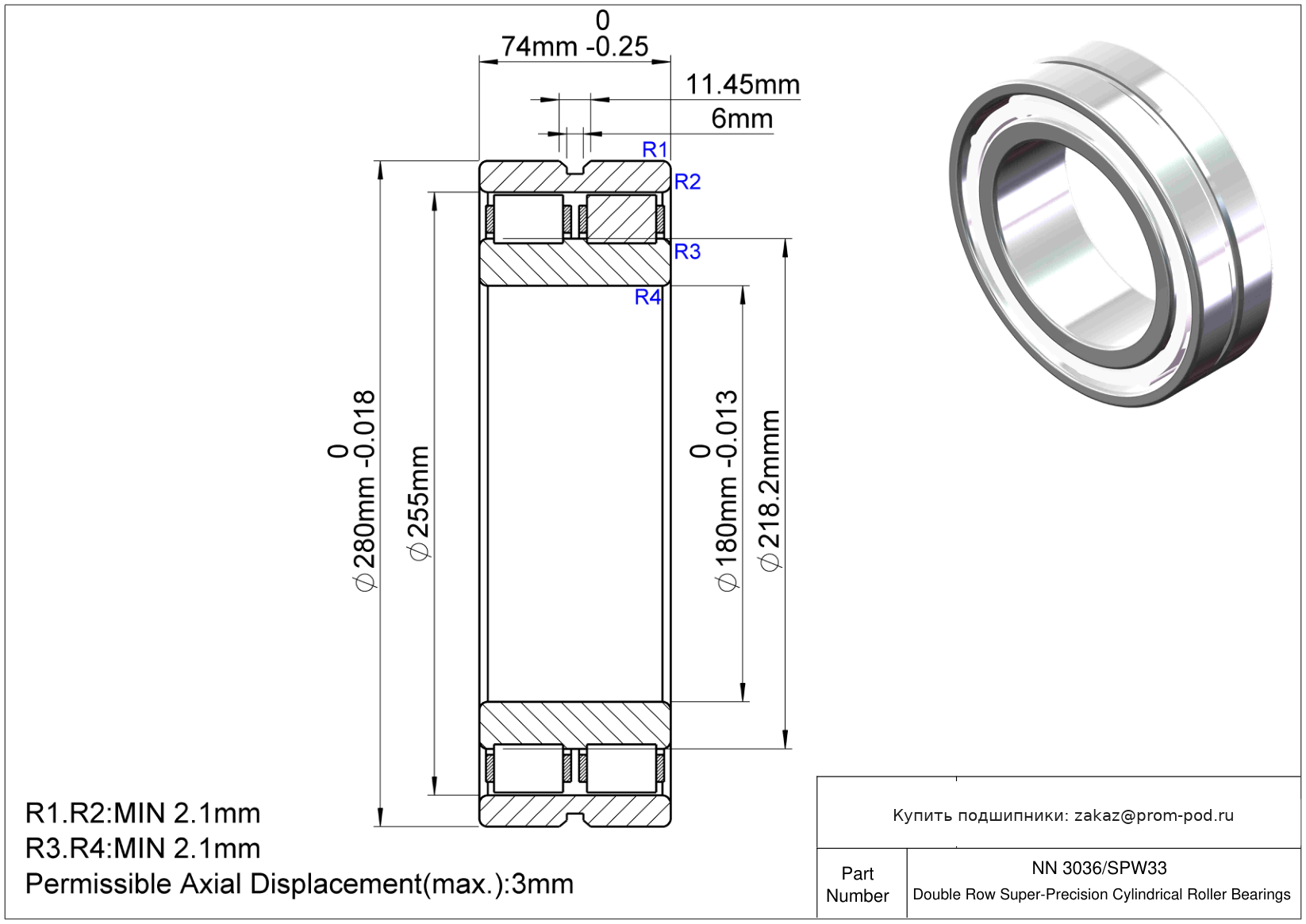 Для двухрядных цилиндрических роликоподшипников: канавка для смазки и отверстия для смазки в наружном кольце (зависит от размера подшипника: E, E1, E2, E3, E4). Для сферических роликоподшипников: канавка для смазки и отверстия для смазки в наружном кольце. Внутренний зазор больше С3. Радиальный зазор для цилиндрических роликоподшипников с невзаимозаменяемыми компонентами подшипника. Последующее число указывает на класс зазора (если зазор нормальный, число отсутствует).