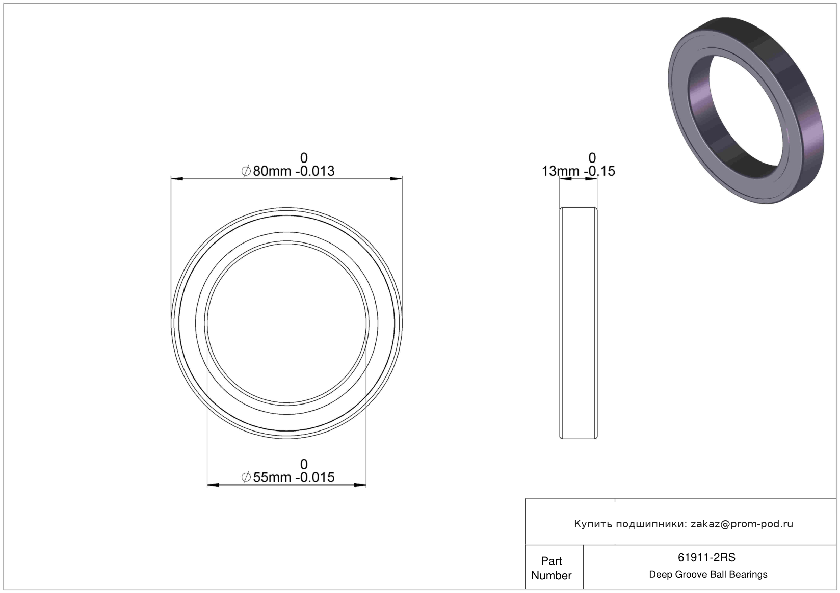 | 6911 2RS | Шариковый подшипник | Уплотнение с обеих сторон, NBR. |